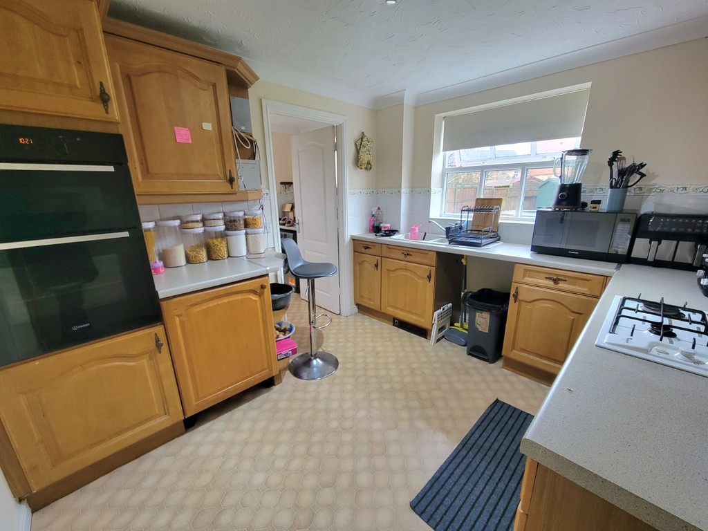 KITCHEN: 10' 4" x 9' 0" (3.15m x 2.74m) Fitted with a generous range of base and wall mounted units having solid oak panelled doors and drawer fronts, fitted worktops inset with one and half bowl sink unit with mono mixer tap, inset four ring gas hob with extractor fan connected over, space for dishwasher, integrated black glass eye level oven and grill, generous built-in understairs larder cupboard, double glazed window overlooking the rear garden.