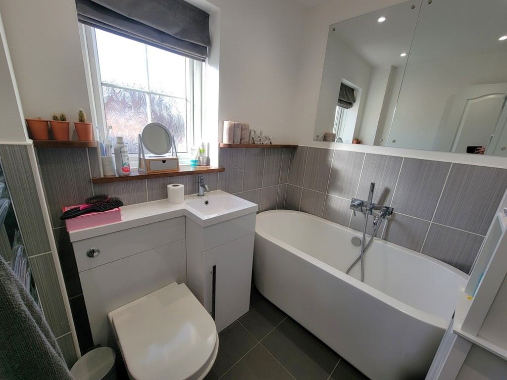 FAMILY BATHROOM: 6' 7" x 5 ' 6" (2.01m x 1.68m) White suite comprises free standing bath with shower mixer tap, low level wc with concealed cistern and vanity unit inset wash hand basin with mixer tap and storage cupboard below, heated towel rail, half tiled walls, tiled floor, PVC double glazed window to the rear aspect.