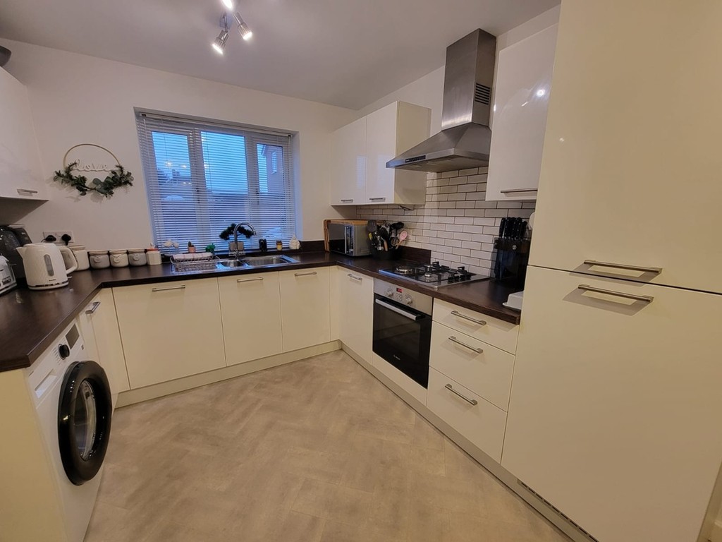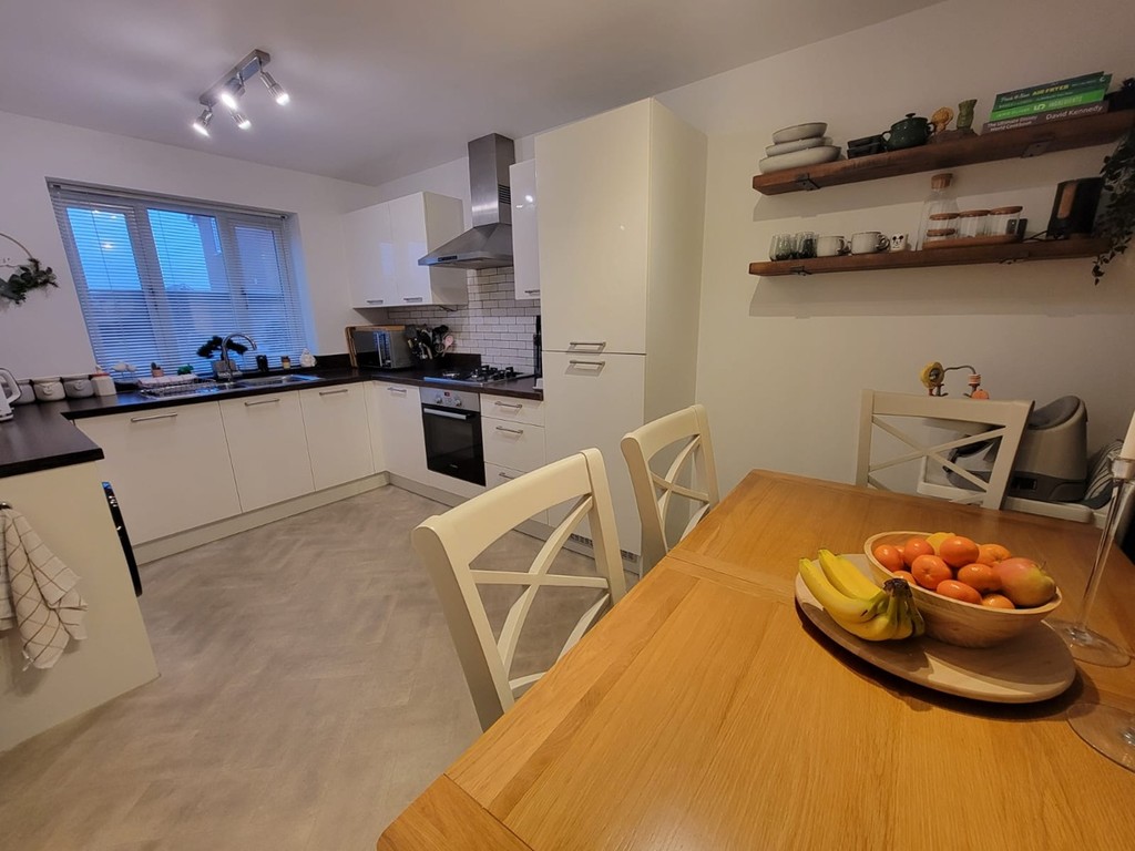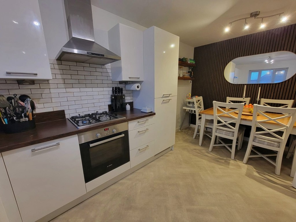 KITCHEN/DINING ROOM: 15' 4" x 9' 7" (4.67m x 2.92m) Kitchen fitted with an extensive range of base and wall mounted units having contemporary high gloss doors and drawer fronts, fitted wood effect worktops inset with one and a half bowl stainless steel sink unit with mixer tap, plumbing for washing machine ,integrated fridge/freezer, stainless steel and black glass fan assisted oven, four ring gas hob above, stainless steel extractor fan connected over, metro style wall tiling, herringbone effect flooring, space for generous dining table, PVC double glazed window to the front aspect.