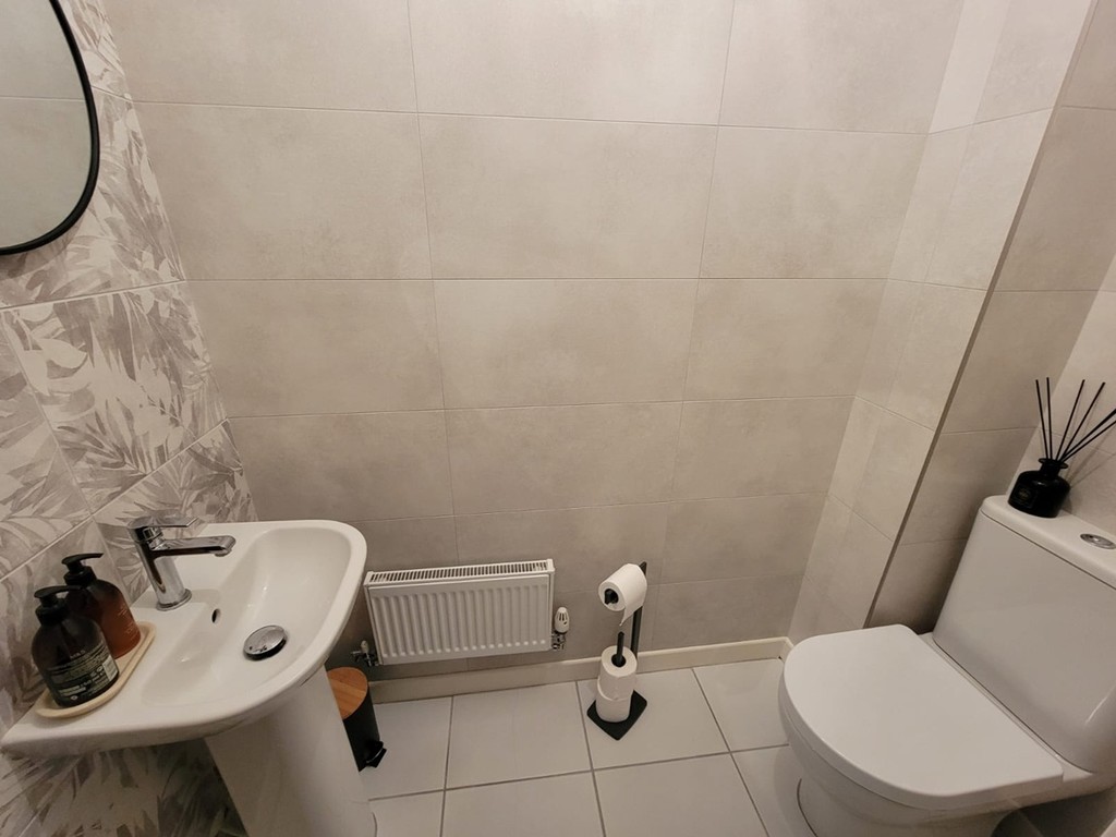 GROUND FLOOR CLOAKROOM: White suite comprises low level wc and wall mounted wash hand basin, fully tiled walls, tiled floor, extractor fan, radiator.