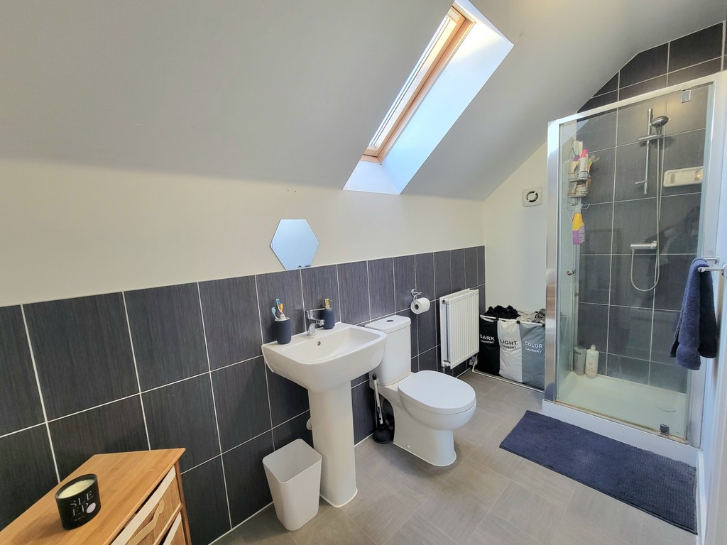 EN-SUITE: White suite comprises low level wc, pedestal wash hand basin and generous double shower enclosure with glazed screen, raised storage area, velux roof window to the rear aspect.