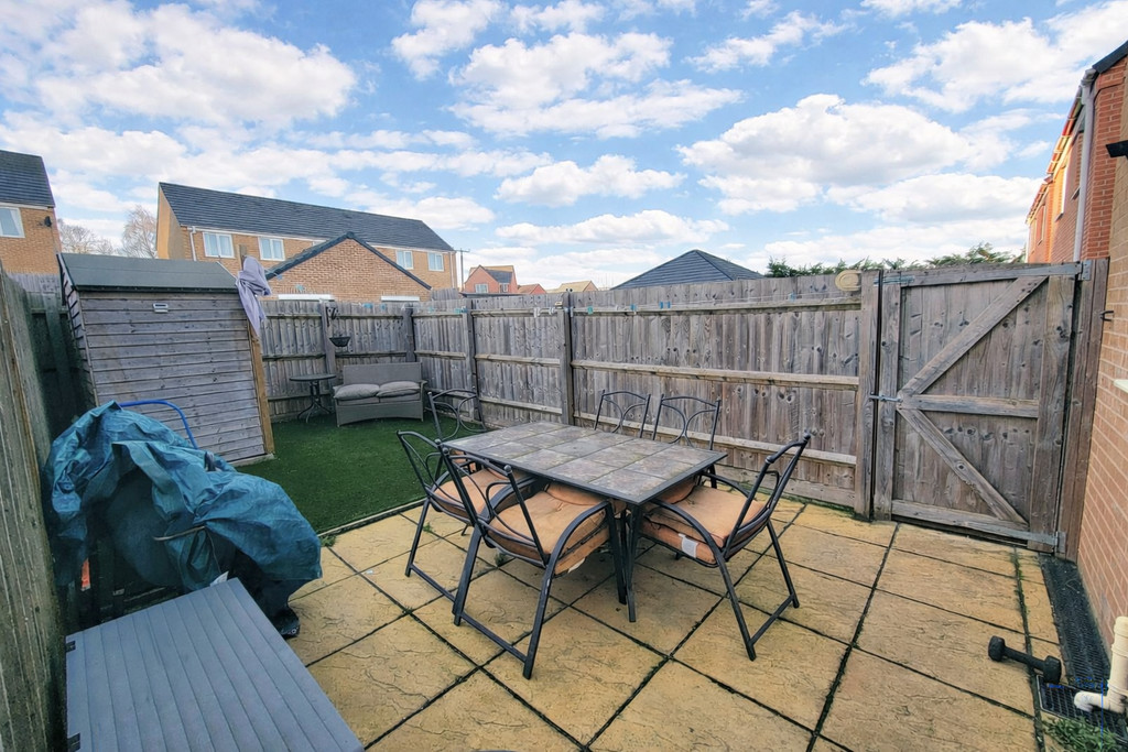 OUTSIDE: The rear garden comprises an enlarged patio leading to the artificial lawn with fenced boundaries, timber garden store. Gated access leads to a generous block paved drive providing parking for two to three cars.