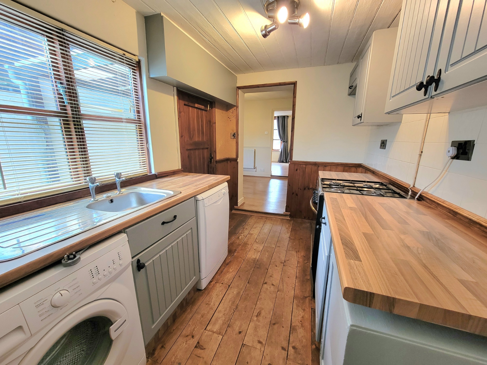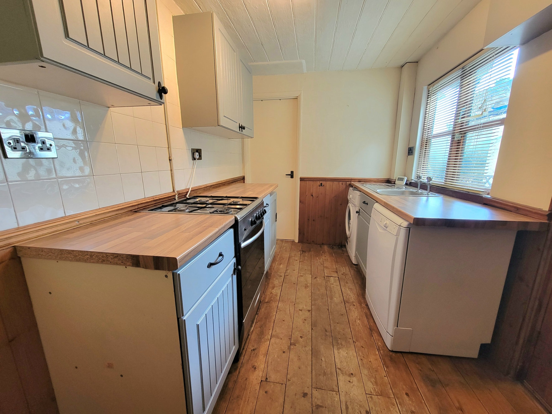 12' 0" x 6' 2" (3.66m x 1.88m) Fitted with a good range of base and wall mounted units having shaker style doors and drawer fronts, fitted wood effect worktops inset with stainless steel single bowl sink unit with drainer, gas cooker point, plumbing for washing machine, space for dishwasher and fridge/freezer, natural pine polished floorboards, feature match boarded ceiling, panelled door opens directly to the garden, generous sealed unit double glazed window to the side aspect.