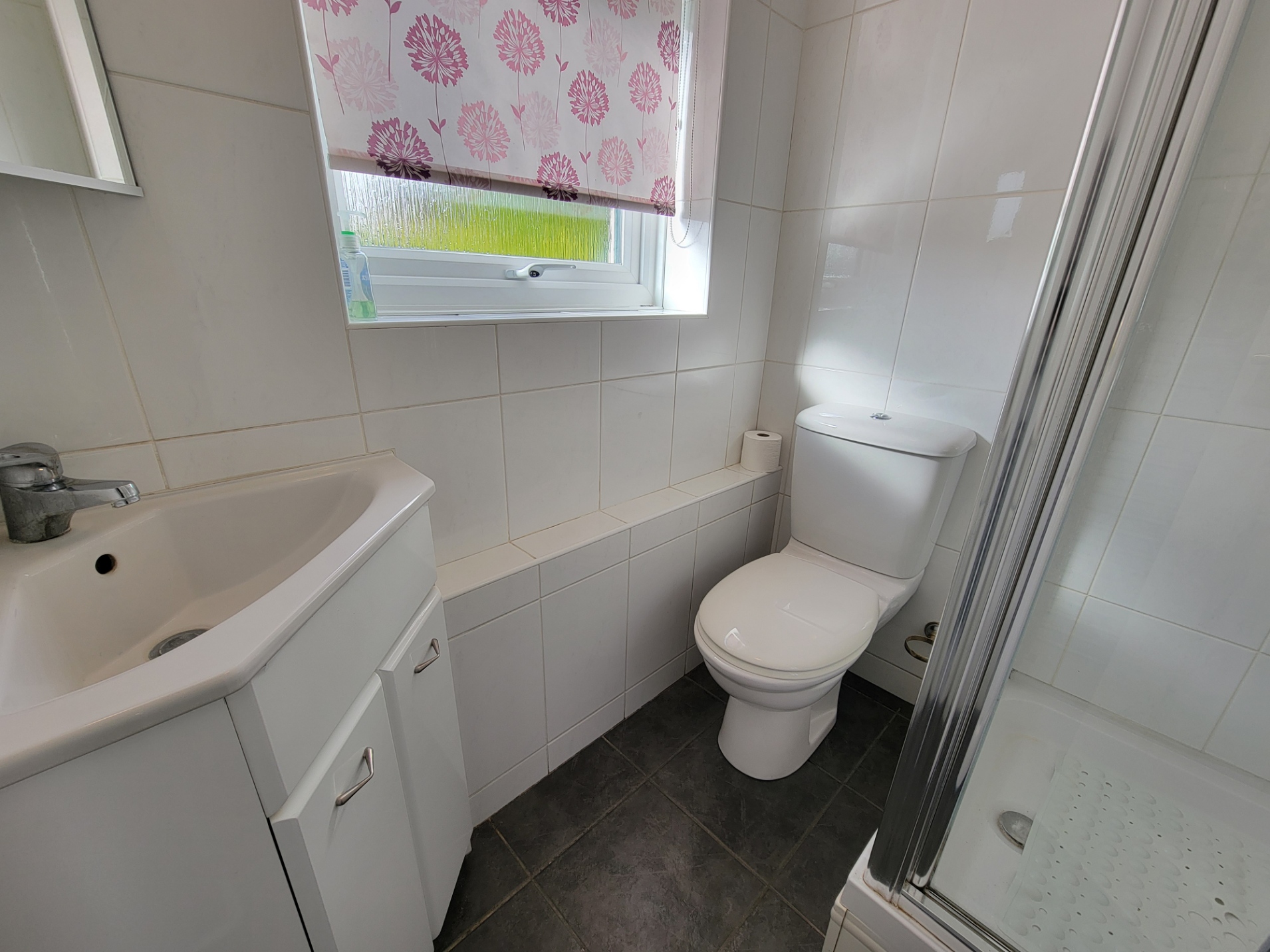 Shower room: Modern suite comprises low level wc, independent shower enclosure with glazed screen and vanity unit with inset corner wash hand basin, mono mixer tap and storage cupboards below, extensive wall and floor tiling, PVC double glazed window to the rear aspect.