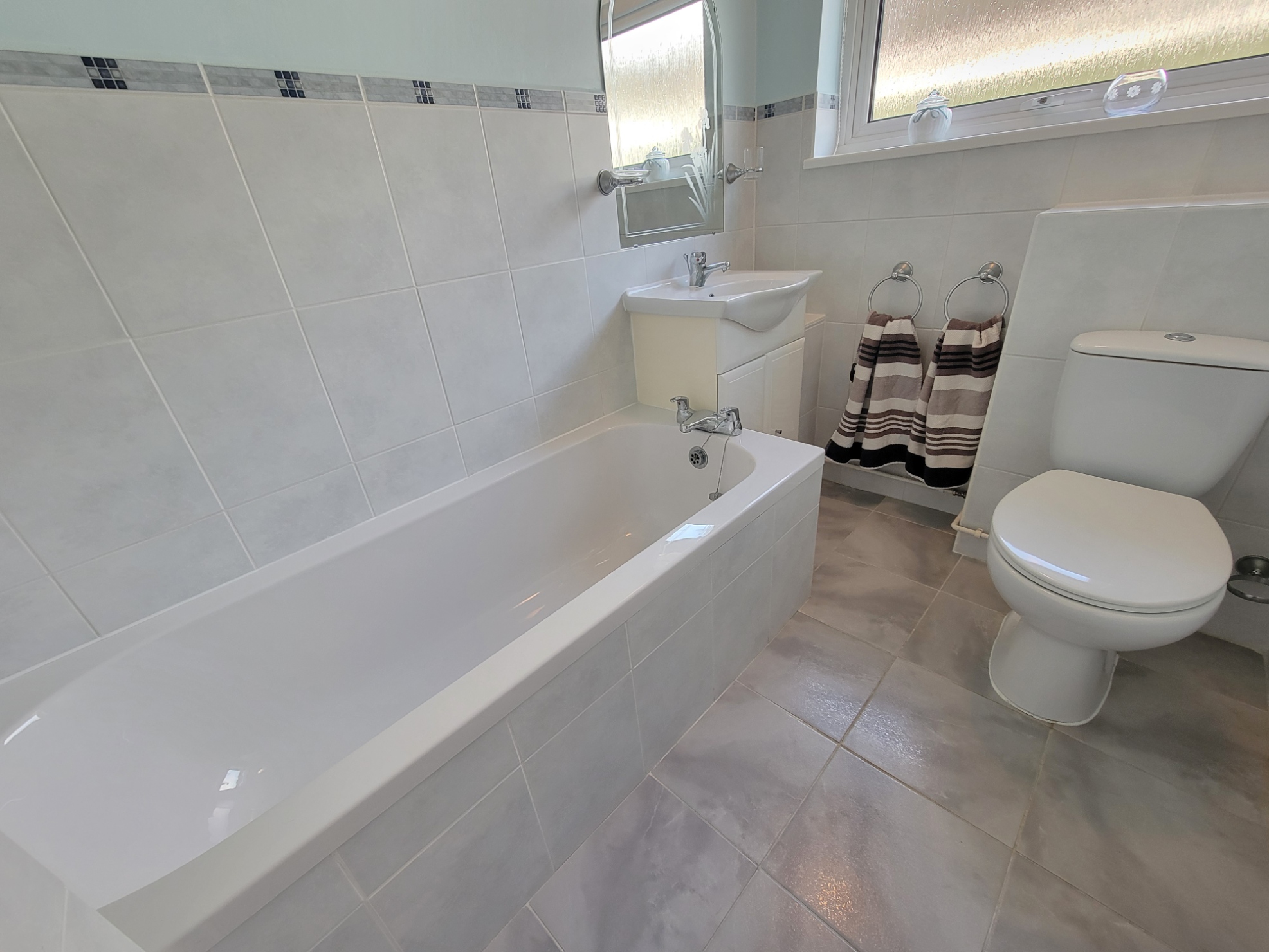 Bathroom: Modern suite comprises panel bath with mixer tap, low level wc and vanity unit inset ceramic wash hand basin with mono mixed tap and storage cupboards below, chrome towel radiator, tiled floor, extensive wall tiling, spotlights, extractor fan, PVC double glazed window to the side aspect.