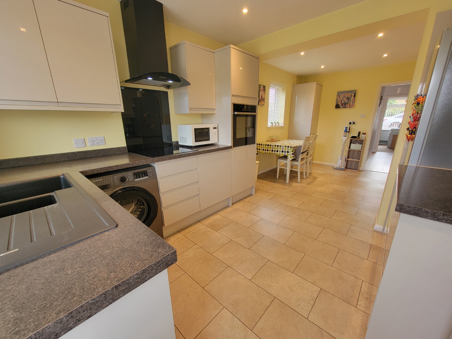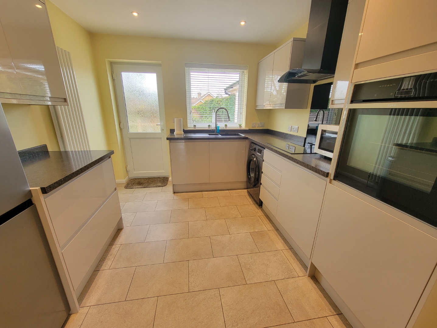 20' 4" x 9' 8" (6.2m x 2.95m) Fitted with an extensive range of good quality, contemporary style base and wall mounted units having matching grey doors and drawer fronts, grey granite style worktops inset with one and a half bowl sink unit with mixer tap, wide pan drawers, plumbing for washing machine, eye level stainless steel and glass fan assisted oven, inset black glass ceramic hob, glass splashback and extractor fan connected over, space for fridge/freezer, inset spotlights, contemporary style radiator, stone effect floor tiling, inset spotlights, high level tv point, generous PVC double glazed windows to the rear and side aspects, part glazed door opening to the rear garden.