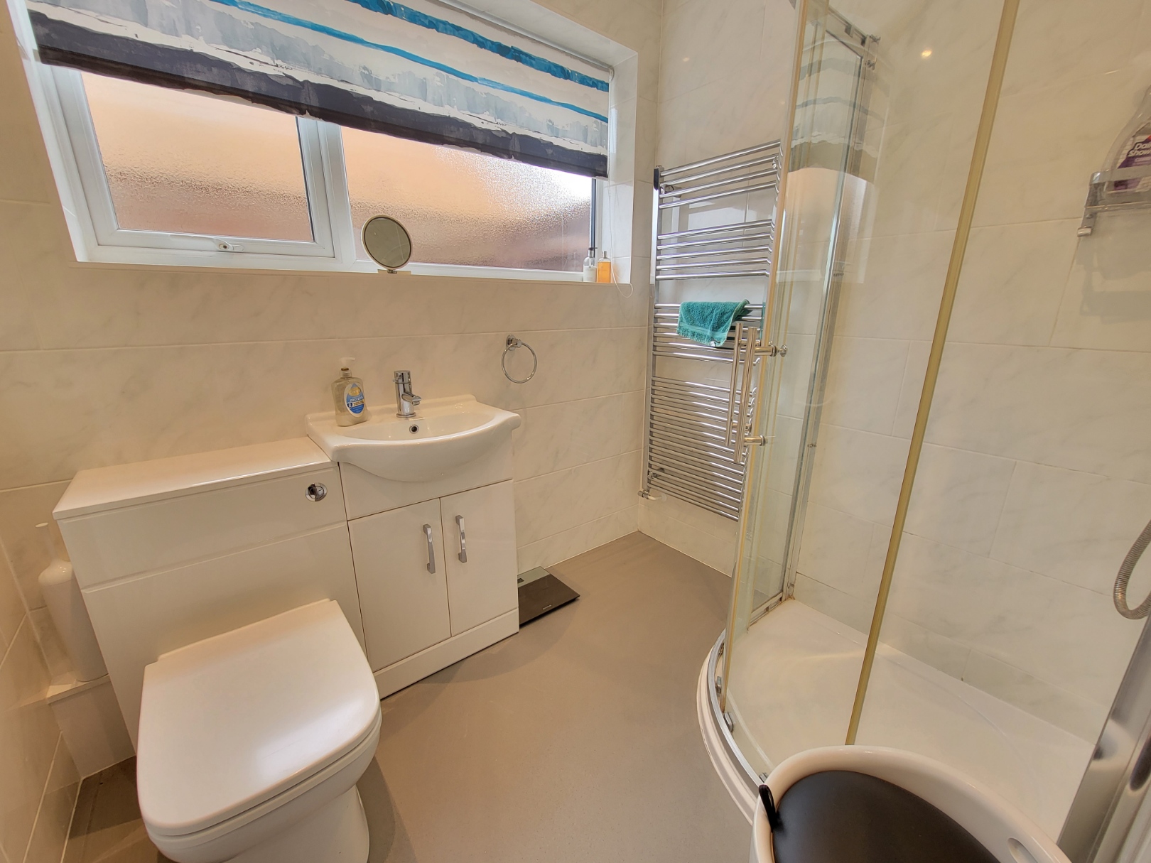Re-fitted suite comprising low level wc with concealed cistern, independent shower enclosure with curved glazed screen and built-in vanity unit with inset wash hand basin and storage cupboards below and mono mixer tap, chrome towel radiator, non slip flooring, extensive wall tiling, PVC double glazed window to the side aspect.