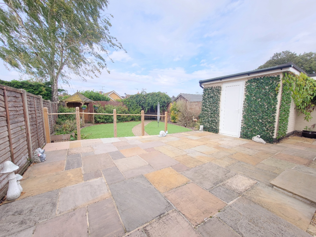 The bungalow is set nicely back with low maintenance gravel garden, adjacent block paved drive providing parking for at least two vehicles. Gated access leads to further enclosed drive. Immediately to the rear of the house there is a brick built store with PVC double glazed window and door, generous Indian sandstone terrace with wheelchair slope leading to the lower garden, again of low maintenance design with artificial lawn, block paved path to shaded seating area and good quality timber pergola with covered roof. There are mature shrub borders and fenced boundaries.