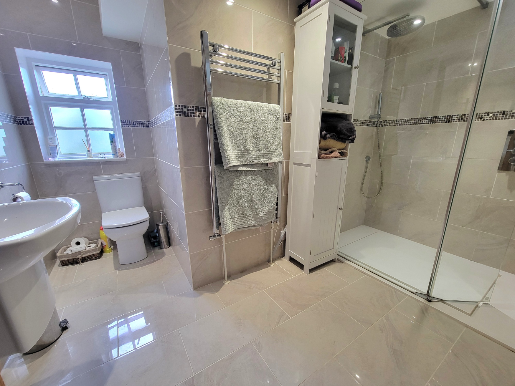 Family shower room: 10' 4" x 8' 4" (3.15m x 2.54m) High quality suite comprises low level wc, wall mounted wash hand basin and generous walk-in double shower enclosure with fixed and pivot glazed screen, inset spotlights, extractor fan, extensive stone effect wall and floor tiling, large chrome towel radiator, window to the rear aspect.