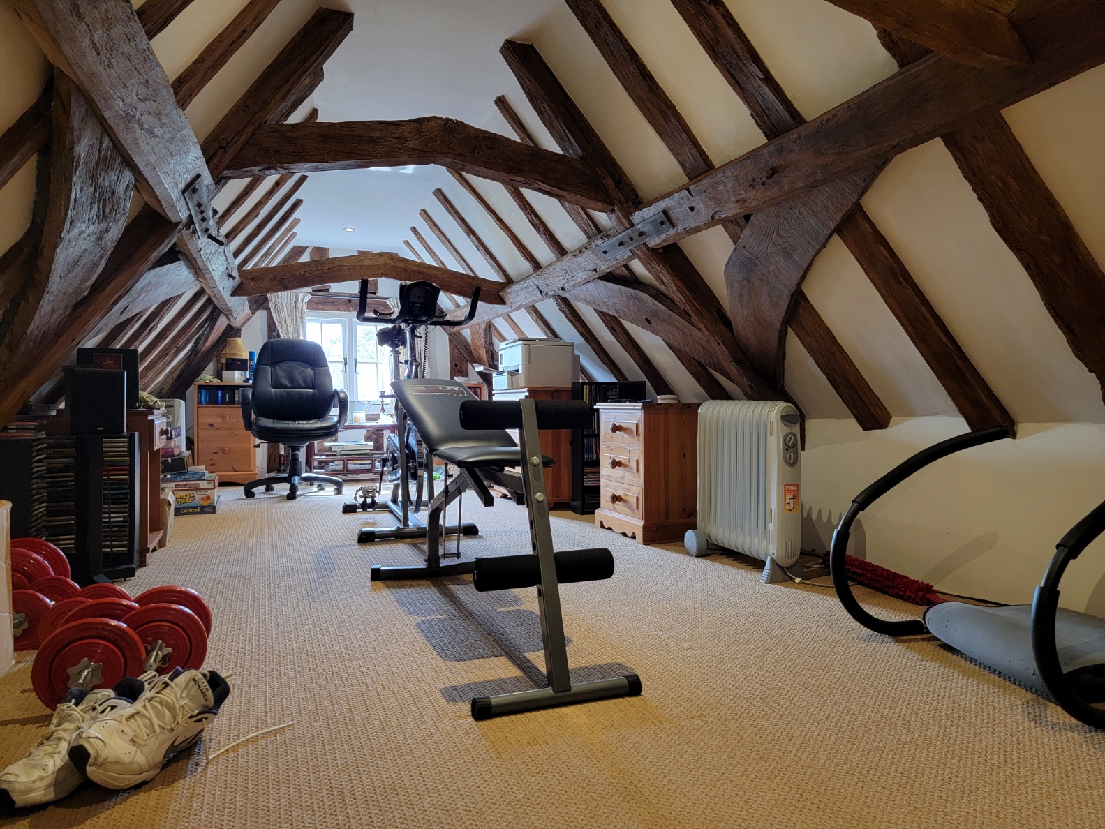 Attic room: 24' 0" x 8' 9" (7.32m x 2.67m) A heavily timbered useful room with partly sloping ceiling, curved staircase, window to the front aspect.
