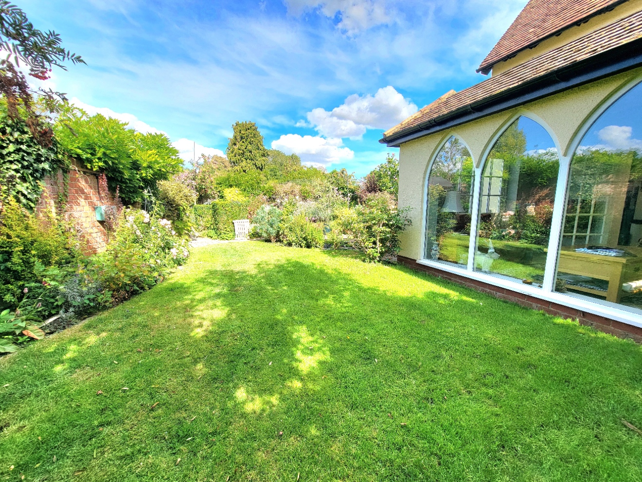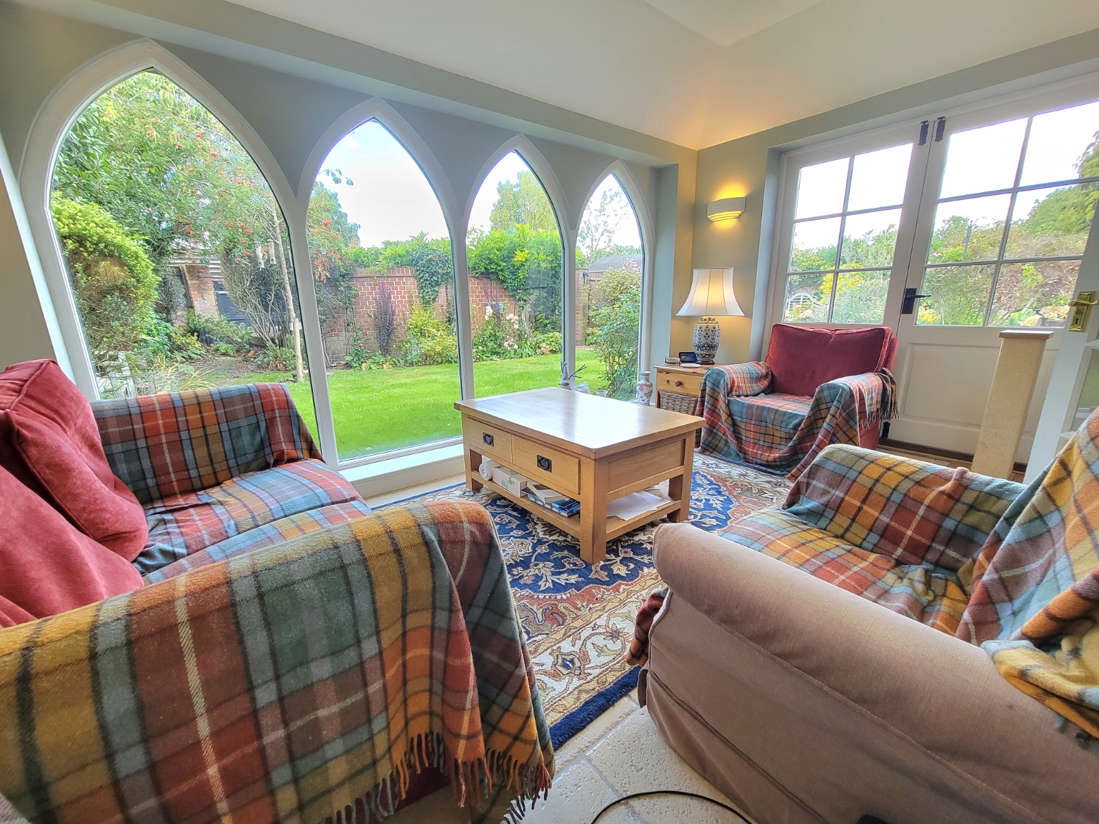 Garden room: 14' 9" x 9' 8" (4.5m x 2.95m) A most appealing room with feature gothic style windows and glazed French doors opening to the garden, radiator, natural stone flooring, wall light points.