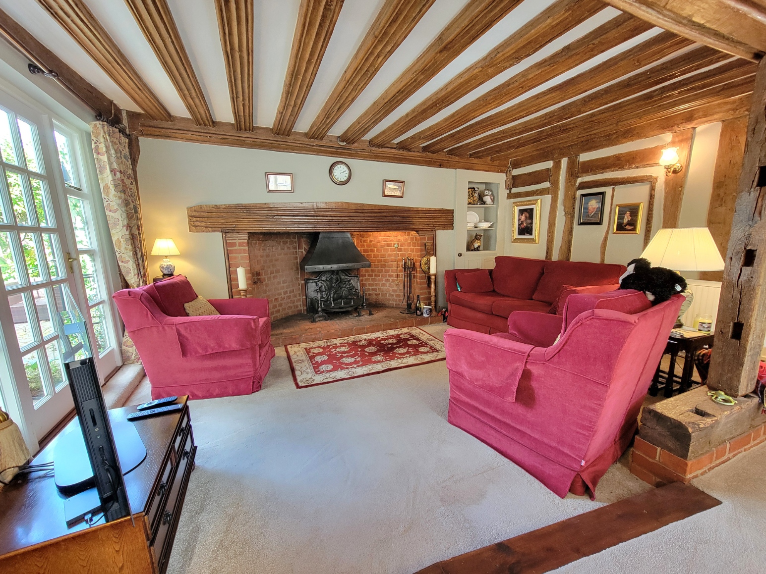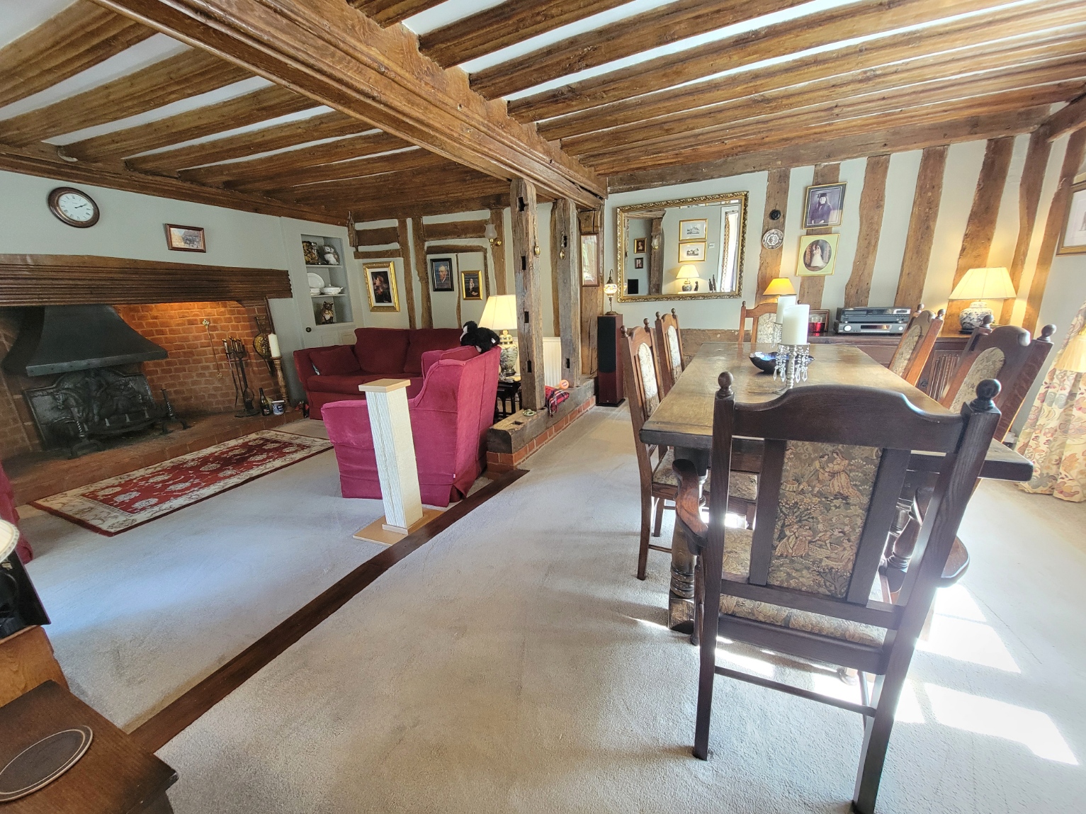 Sitting & dining room: 21' 0" x 16' 3" (6.4m x 4.95m) A stunning room with heavily timbered walls and exceptional fluted timber ceiling, massive red brick inglenook fireplace with rare fluted bressummer beam, herringbone brick hearth with iron grate, open studwork, glazed door and windows leading to the garden, alcove with built-in cupboard and open shelves, two radiators, tv point, generous sash window and side lights to the front aspect.