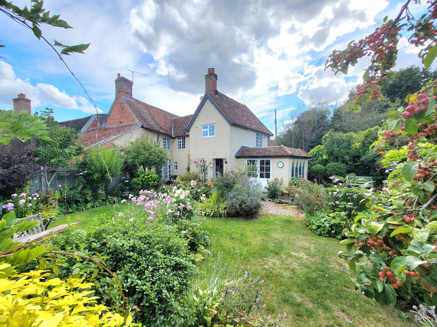 Outside: Heavy wooden double gates open to a block paved drive providing parking for two cars, walled boundaries. Leading to the charming, well stocked, established garden with block paved paths and terrace, open lawns, paved seating and alfresco dining areas, timber garden store. The garden offers a good degree of privacy.