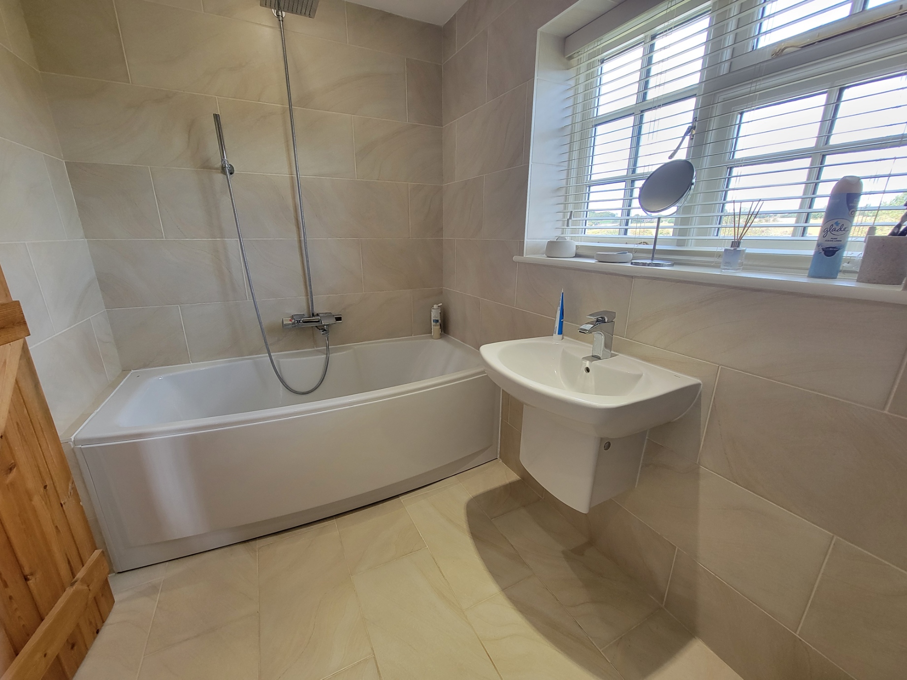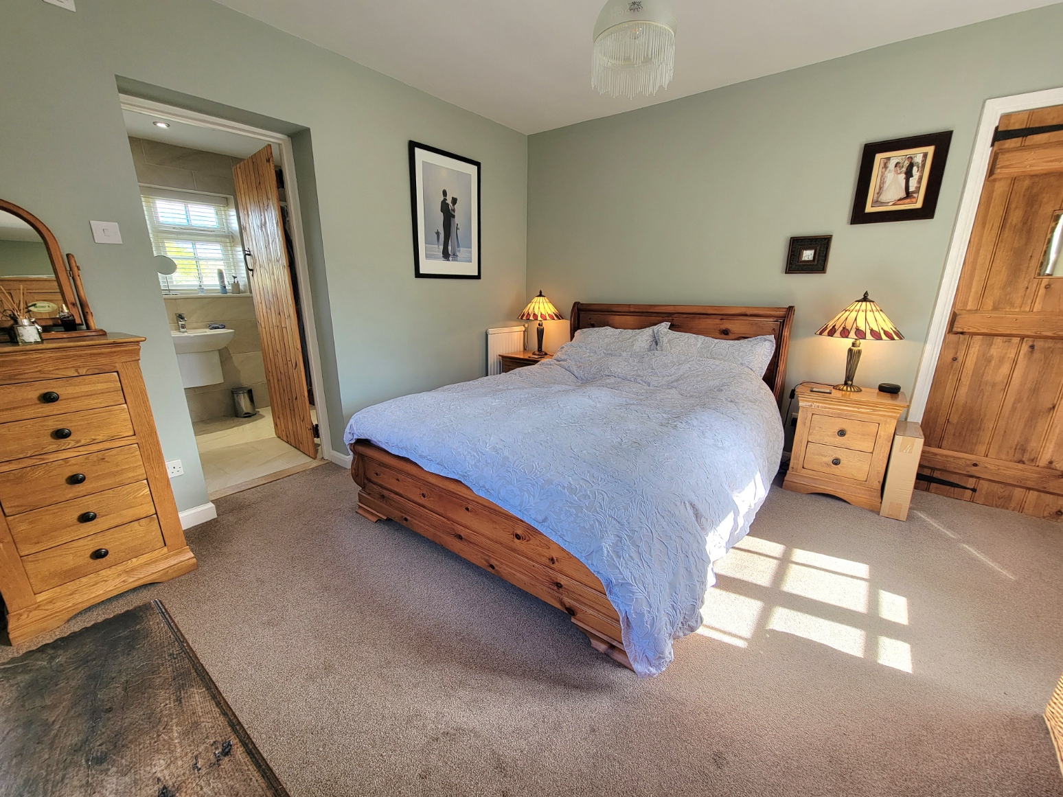 En-suite: 9' 9" x 5' 6" (2.97m x 1.68m) High quality suite comprises, low level w/c, bath with side mounted mixer tap and shower, overhead roller style shower curtain, wall mounted wash hand basin with mono mixer tap, inset spot lights, extractor fan, radiator, heated chrome towel rail, extensive stone effect floor and wall tiling, window overlooking the garden.