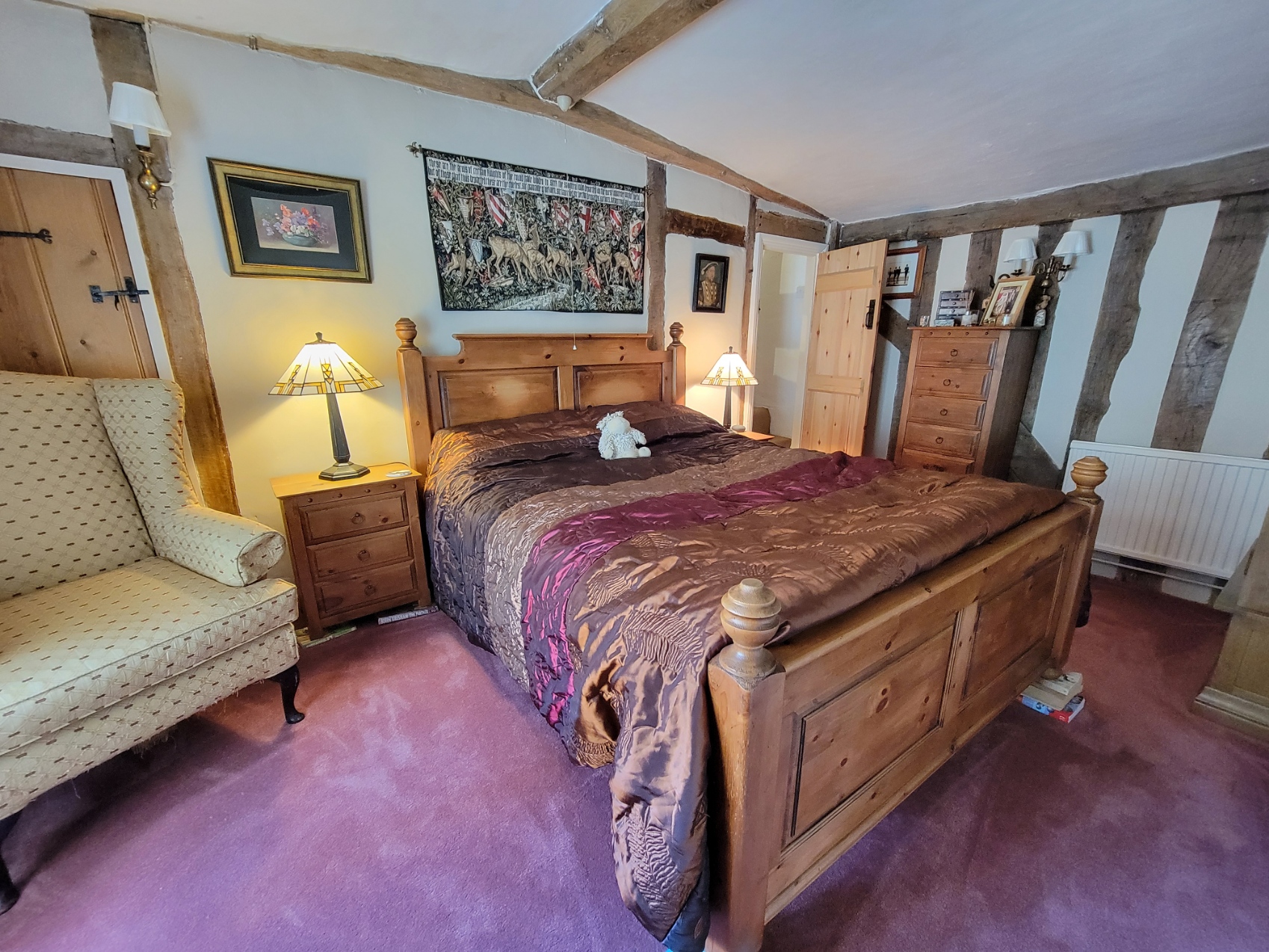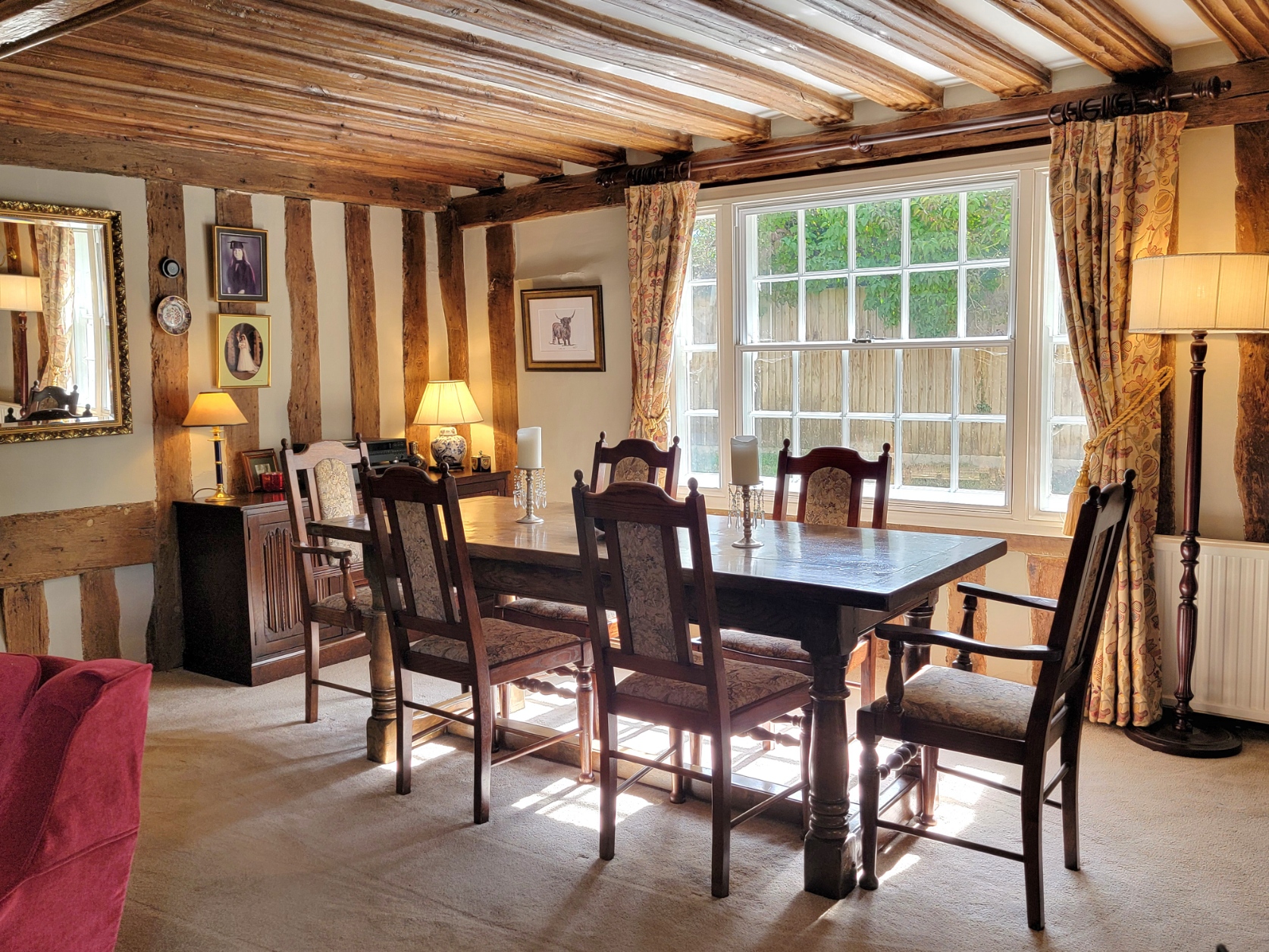 Bedroom 2: 12' 9" x 12' 5" (3.89m x 3.78m) A beautiful atmospheric room with partly timbered ceiling with interesting pargeting detail and heavily timbered walls, radiator, window to the front aspect.