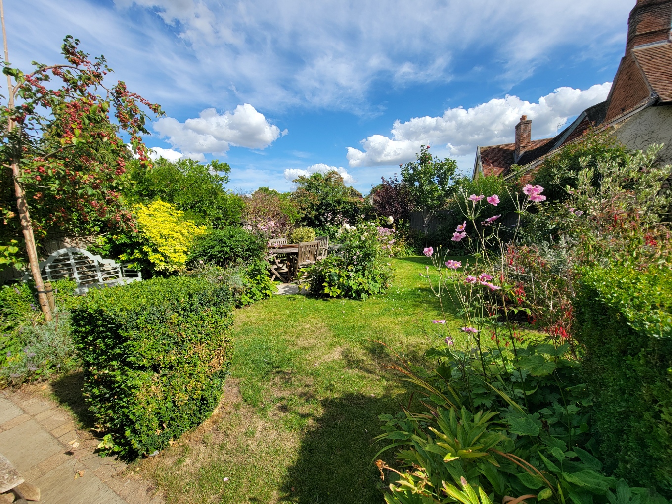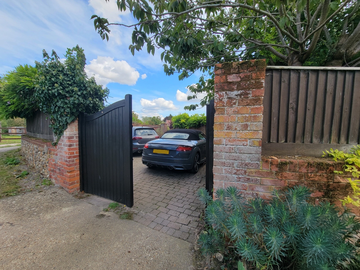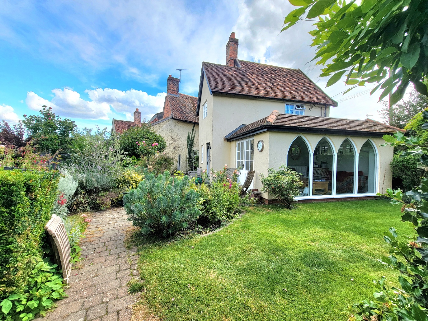 Outside: Heavy wooden double gates open to a block paved drive providing parking for two cars, walled boundaries. Leading to the charming, well stocked, established garden with block paved paths and terrace, open lawns, paved seating and alfresco dining areas, timber garden store. The garden offers a good degree of privacy.