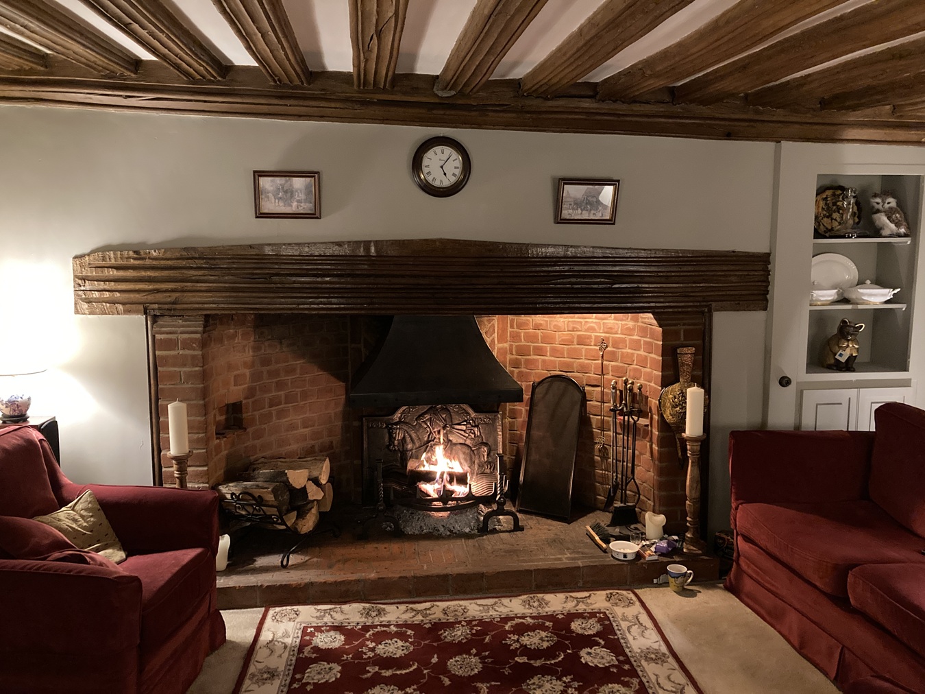 Drawing room: 21' 0" x 16' 3" (6.4m x 4.95m) A stunning room utilised by the owners for both sitting and dining. This room displays heavily timbered walls, an exceptional fluted ceiling, massive red brick inglenook fireplace with rare fluted bressummer. All of which underpin its 16th century origins. The room benefits from a glazed door and windows leading to the garden, an alcove with built-in cupboard with open shelving, two double radiators, tv point and a generous sash window and side lights to the front aspect.