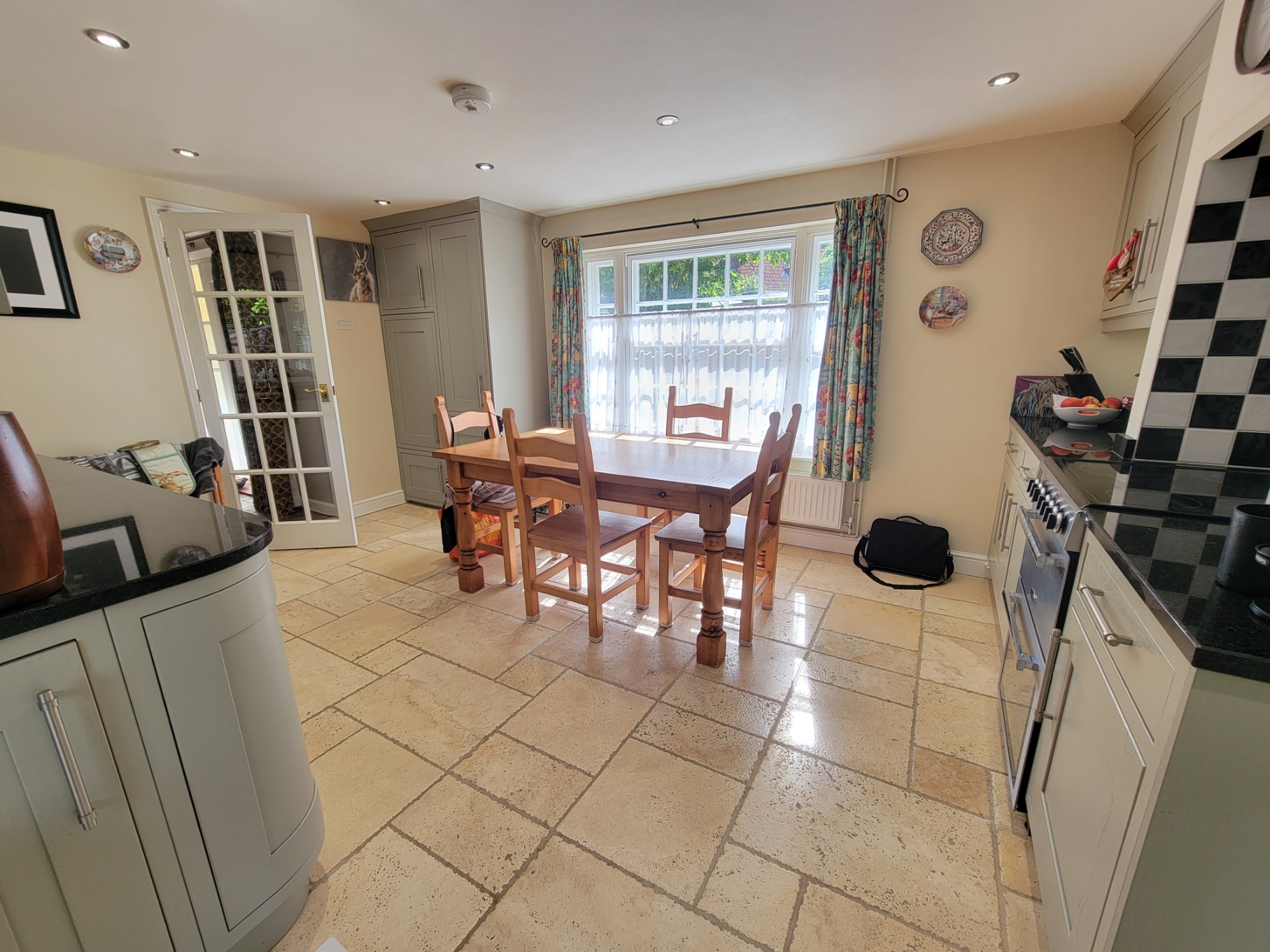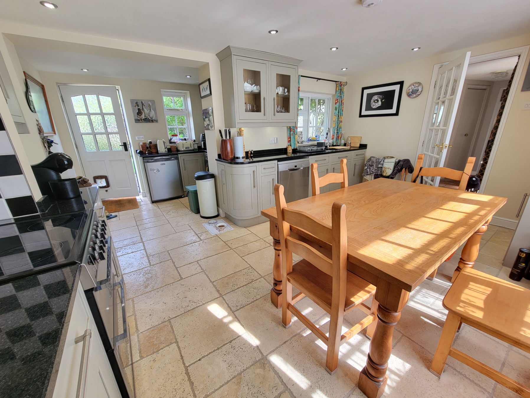 Kitchen/breakfast room: 17' 9" x 15' 5" (5.41m x 4.7m) Fitted with an extensive range of good quality French grey shaker style base and wall mounted units, build-in freezer unit, solid granite work surfaces, inset one and a half sink unit with mixer tap, travertine stone flooring, space for electric cooker and under counter fridge, water softener, plumbing for dishwasher and washing machine, inset lighting, radiator, wall mounted gas fired boiler, sash window with side lights to the front aspect and half glazed door leading to the garden.
