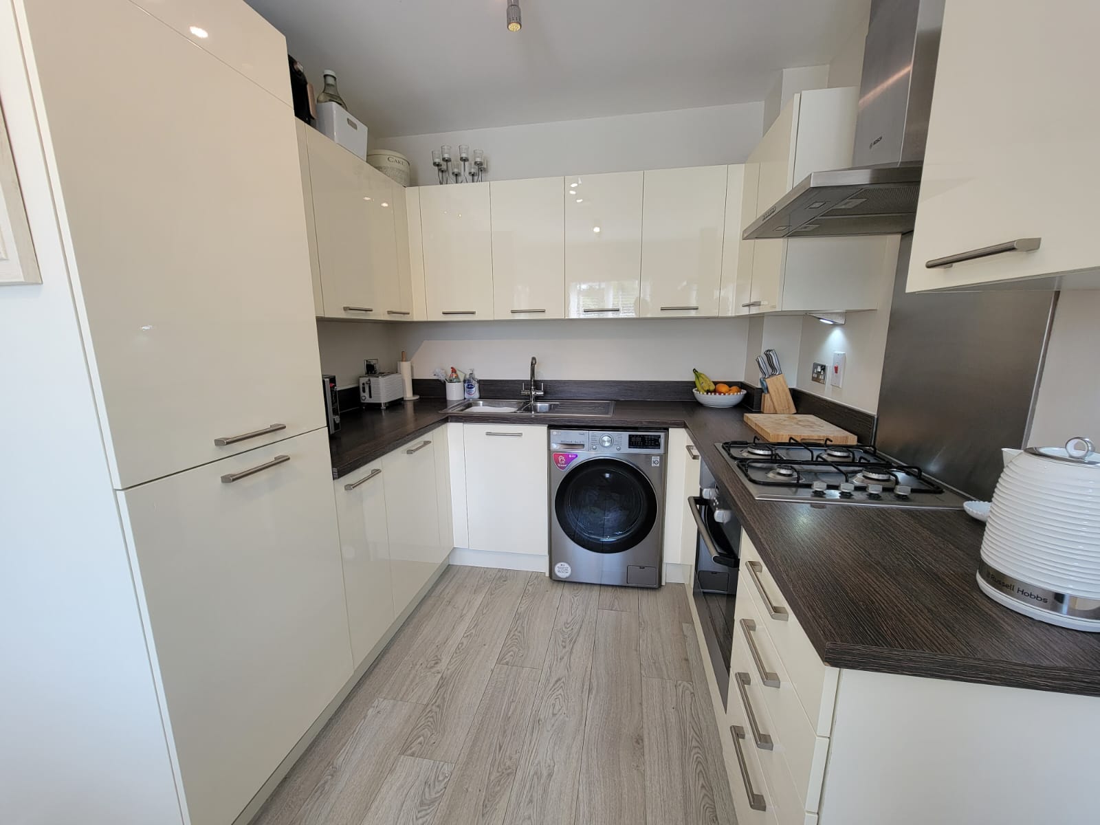 15' 9" x 8' 0" (4.8m x 2.44m) Fitted with a generous range of base and wall mounted units having high gloss doors and drawer fronts, fitted worktops inset one and a half bowl stainless steel sink unit, built-in appliances include stainless steel oven, four ring hob and stainless steel extractor connected over and full height fridge/freezer, plumbing and space for washing machine, radiator, PVC double glazed window to the front aspect with views over the green.