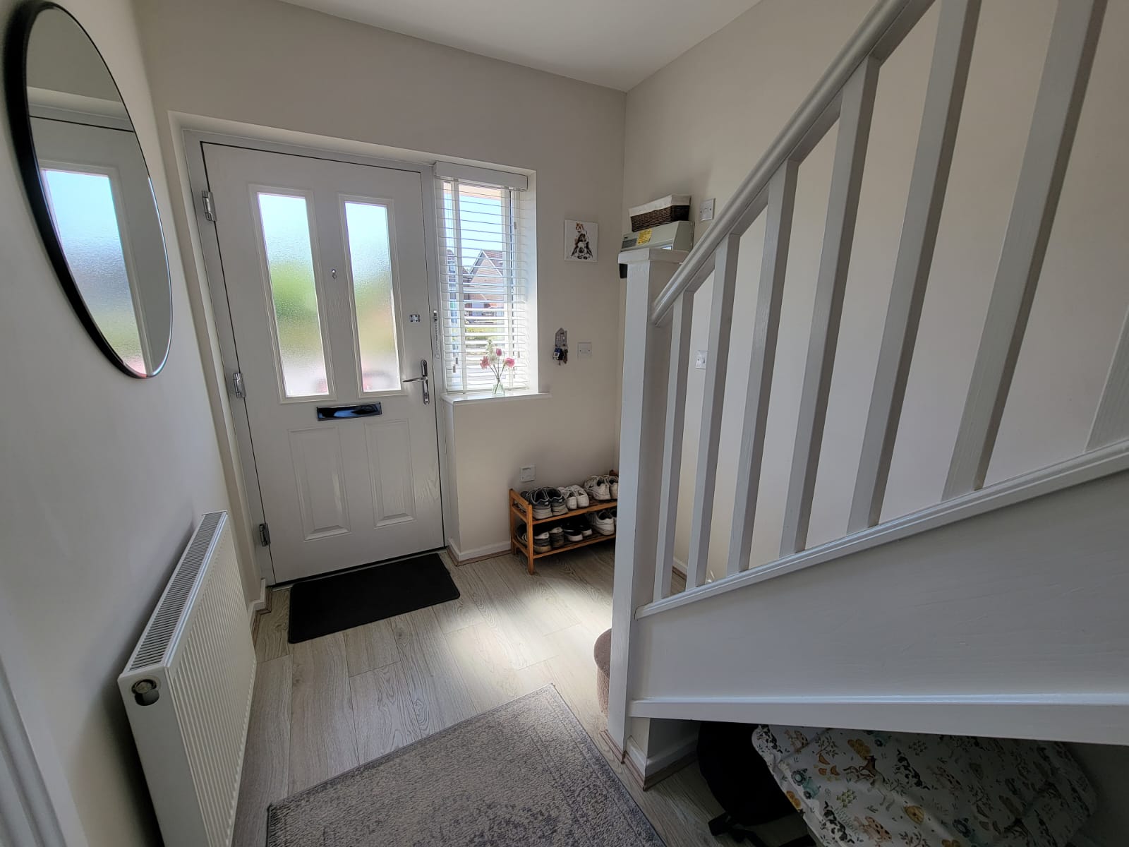 Staircase to the second floor, good size built-in storage cupboard, PVC double glazed window to the front aspect with views over the central green.
