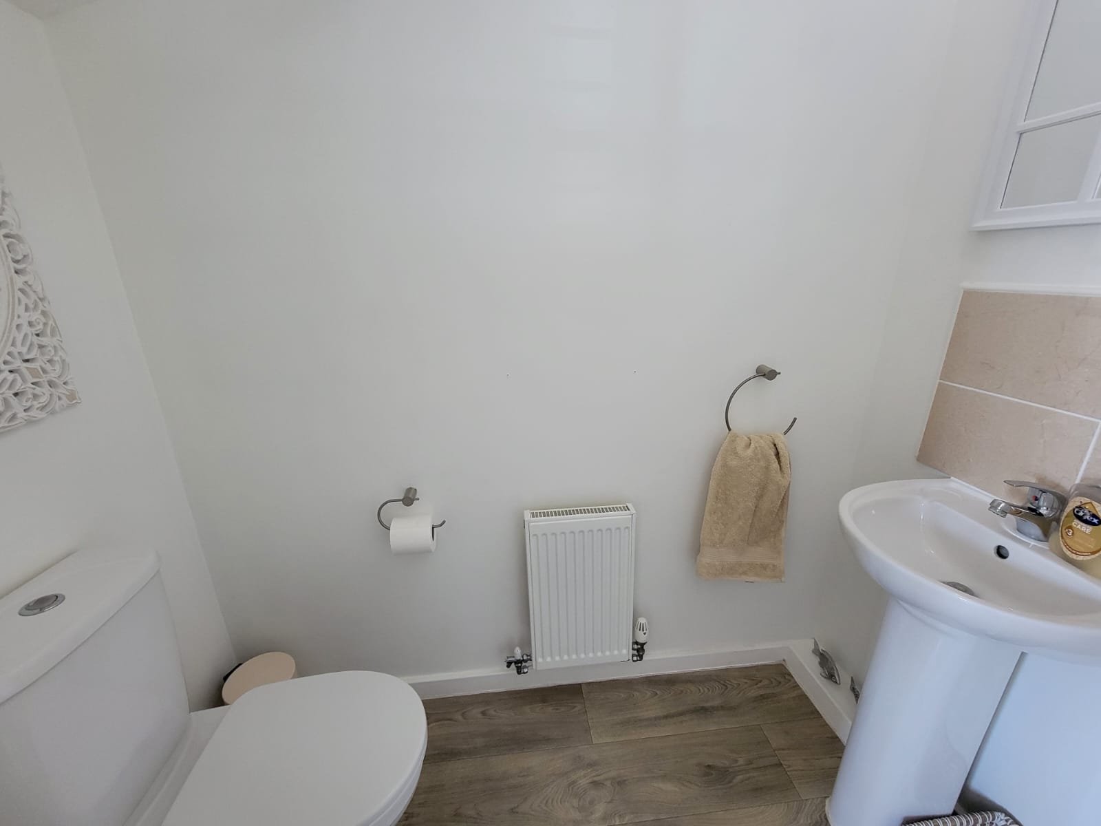 White suite comprises low level wc and pedestal wash hand basin, radiator, extractor fan.
