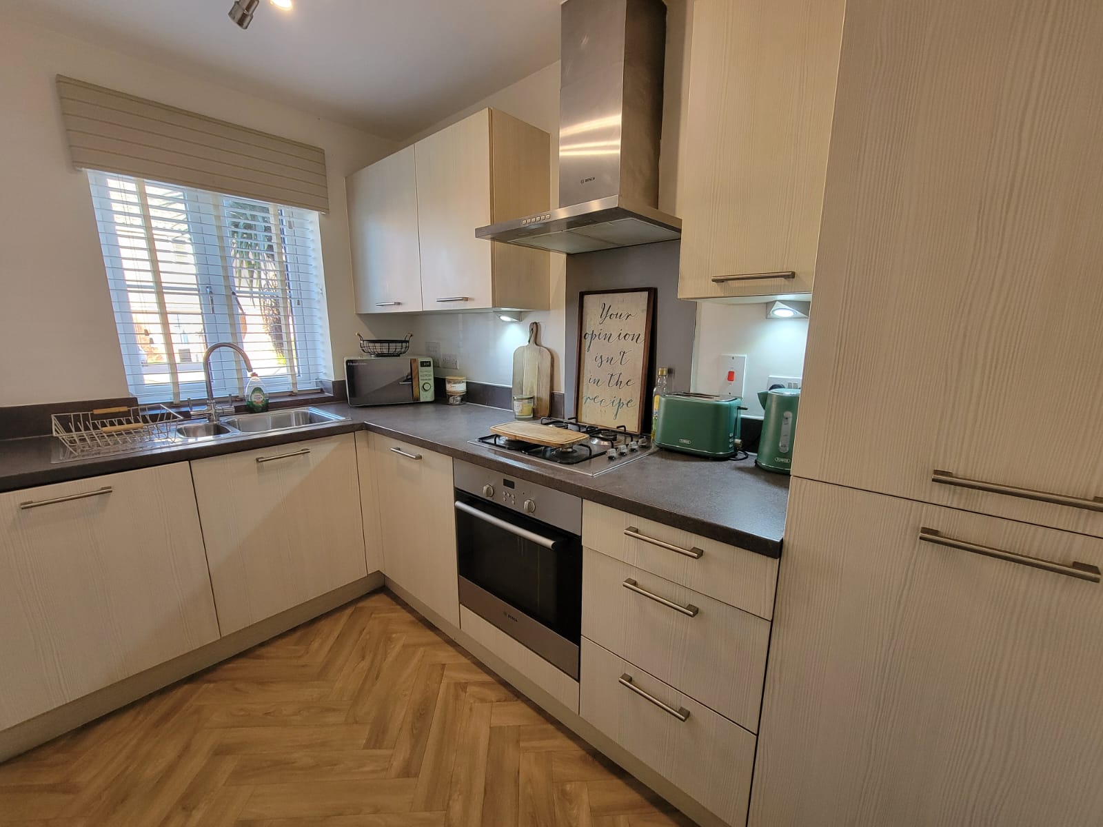 9' 7" x 6' 0" (2.92m x 1.83m) Fitted with a good range of contemporary base and wall mounted units having high gloss doors and drawer fronts, fitted worktops inset one and a half bowl stainless steel sink unit with mixer tap, built-in stainless steel and black glass fan assisted oven, four ring stainless steel gas hob above and contemporary style stainless steel extractor connected over, pelmet lighting, integrated washing machine and fridge/freezer, radiator, wood effect herringbone flooring, PVC double glazed window to the front aspect.