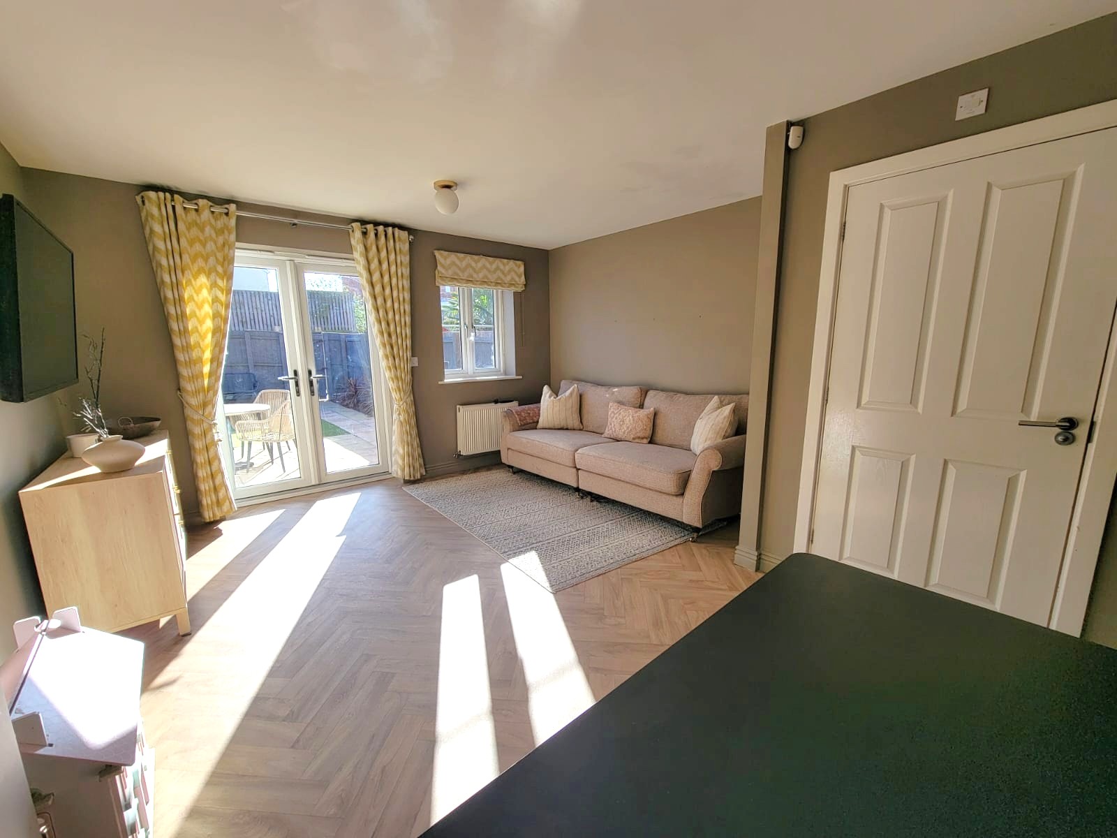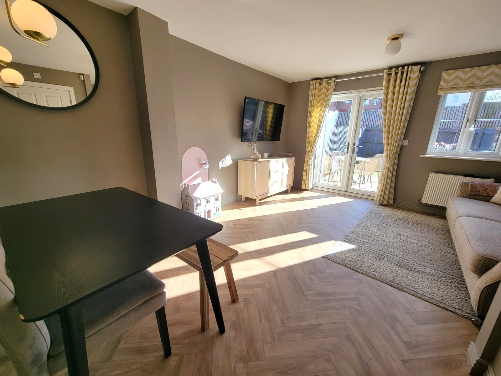 15' 6" x 13' 2" (4.72m x 4.01m) Tv point, radiator, wood effect herringbone flooring, space for generous dining table, wide PVC double glazed French doors opening to the rear garden, PVC double glazed window to the rear.