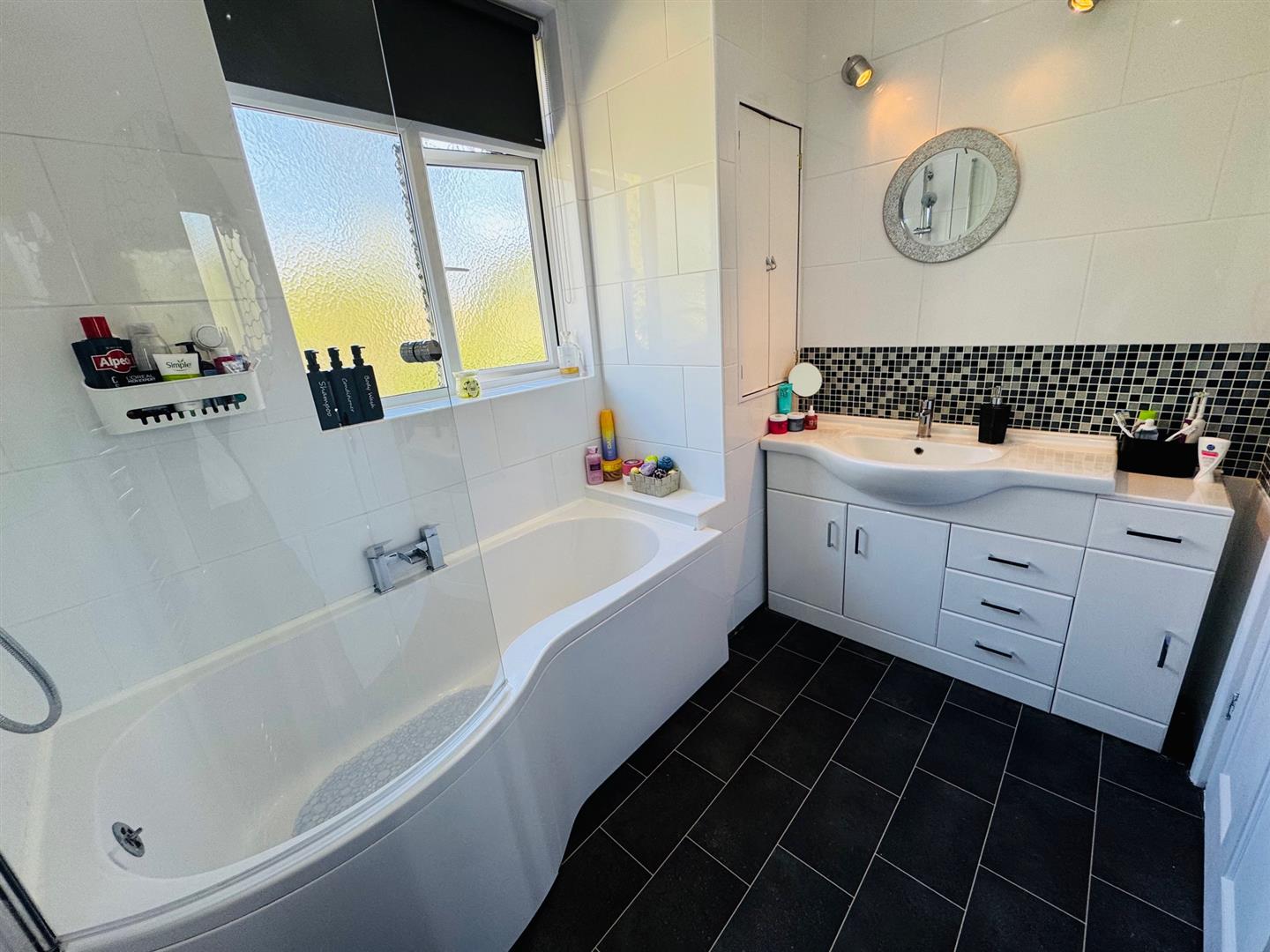 Double glazed window to rear, bath with a shower over, hand wash basin and vanity unit, Vaillant combi boiler fitted 2025, tiled walls, towel radiator.