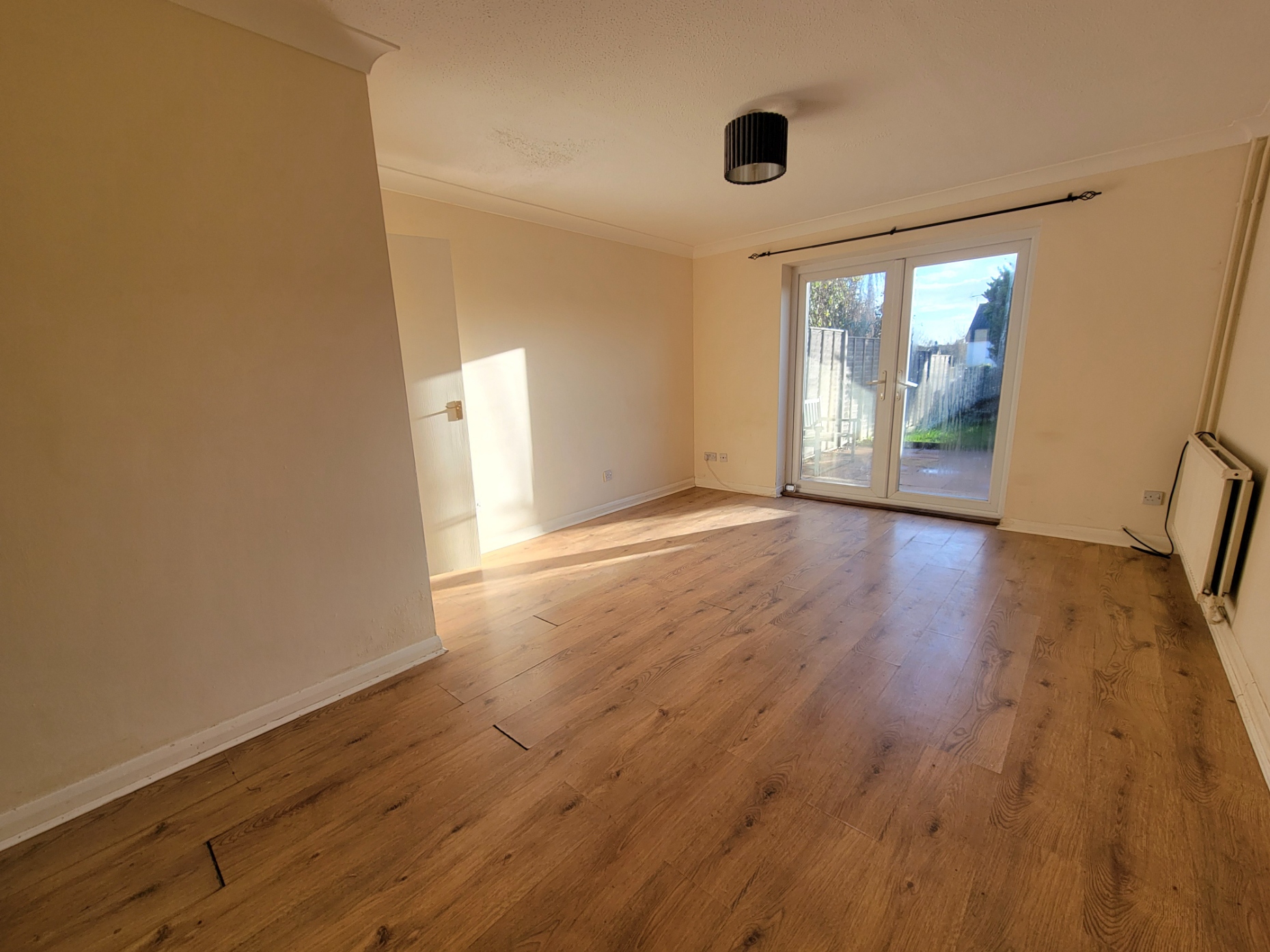 16' 4" x 12' 5" (4.98m x 3.78m) Wood effect flooring, good size built-in understairs storage cupboard, tv point, radiator, PVC double glazed French doors opening directly to the rear garden.