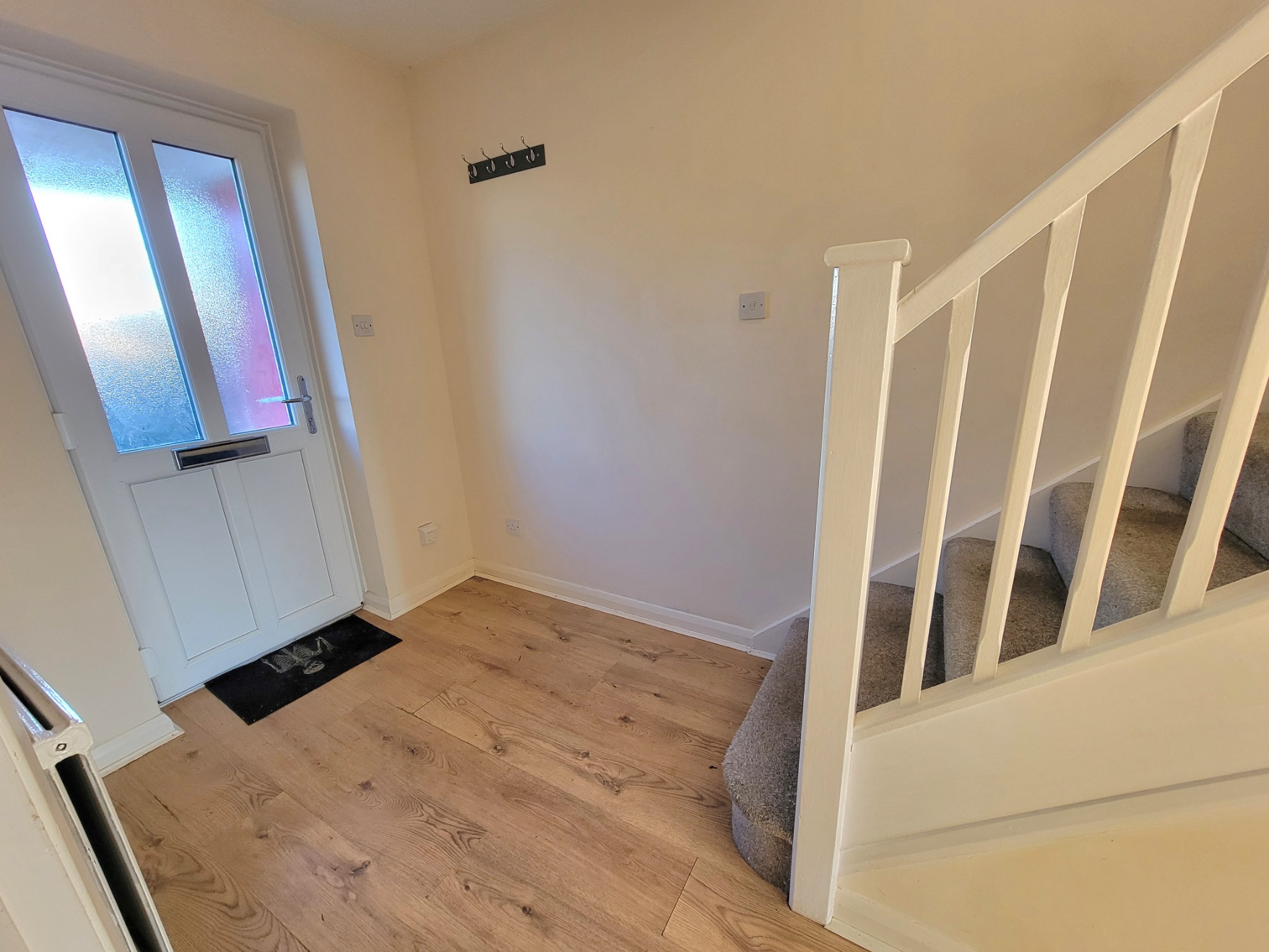 9' 9" x 5' 8" (2.97m x 1.73m) Half glazed PVC entrance door, staircase to the first floor, radiator, wood effect flooring.