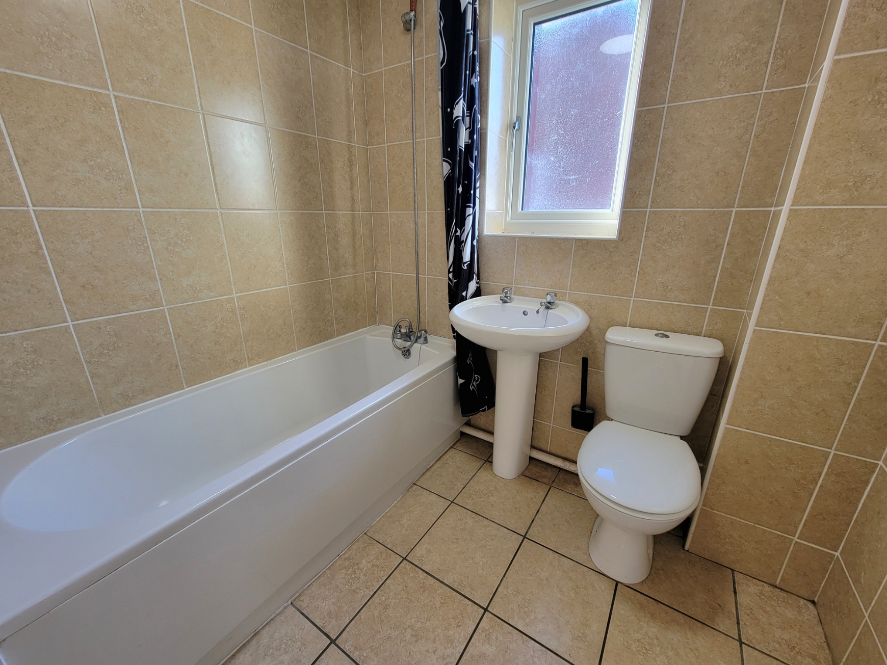 Contemporary white suite comprises panel bath with shower mixer tap, low level wc and pedestal wash hand basin, extractor fan, fully tiled walls and floor, wall mounted towel radiator, PVC double glazed window to the side aspect.