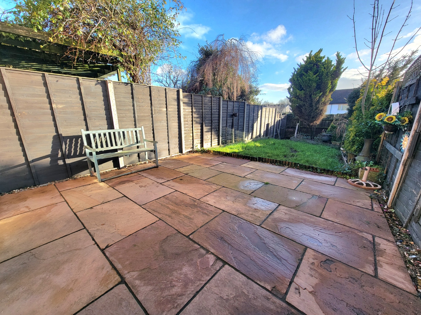 The property is set back from the road with established, well stocked garden, mature hedging. The garden extends to the side with gated access to the rear garden. Immediately to the rear of the house there is a large attractive Indian sandstone terrace leading to a lawn, flower garden with mature tree, hardstanding area to the rear, fenced boundaries. Further gated access leads directly to the parking area.