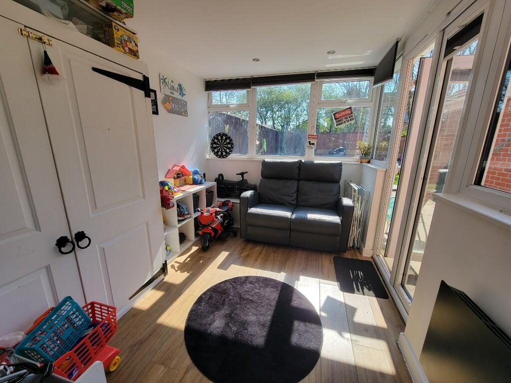 11' 0" x 8' 4" (3.35m x 2.54m) Wood effect flooring, built-in double storage cupboard, PVC double glazed door to the garden.
