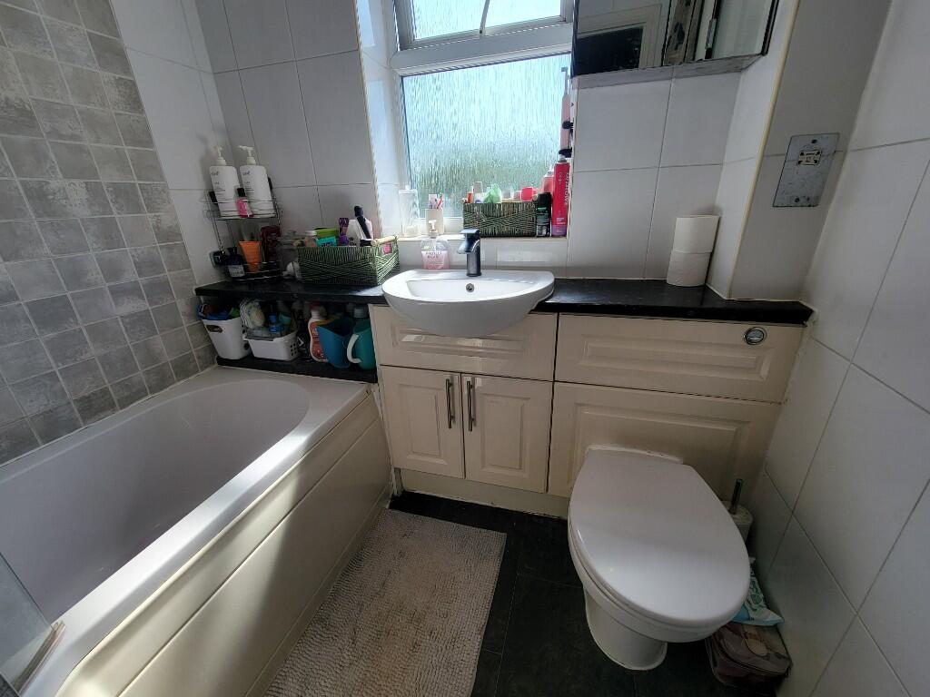 Contemporary suite comprises P shaped shower bath with fitted screen, built-in wash hand basin with storage cupboard below and lo level wc with concealed cistern, towel radiator, PVC double glazed window to the rear aspect