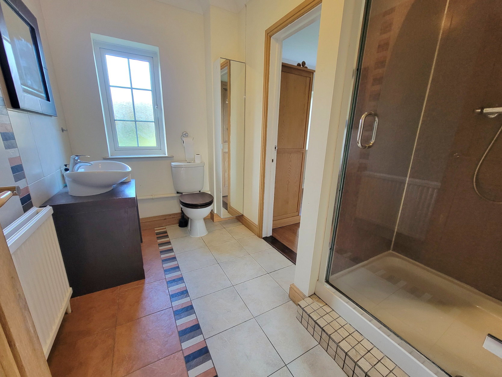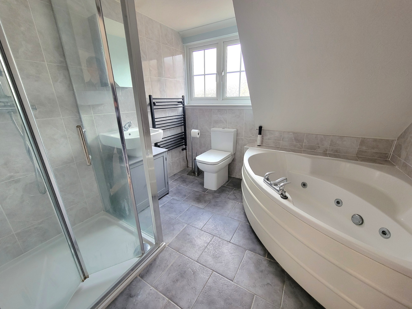 Family bathroom: 8' 1" x 8' 0" (2.46m x 2.44m) Four piece suite comprises low level wc, jacuzzi style bath, separate built-in shower cubicle with glazed screen inset with rainfall shower head and shower mixer tap and pedestal wash hand basin with mixer tap and storage cupboard below, tiled walls and flooring, PVC double glazed window to the side aspect.