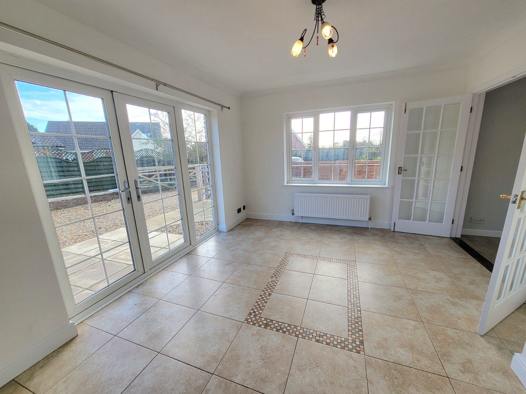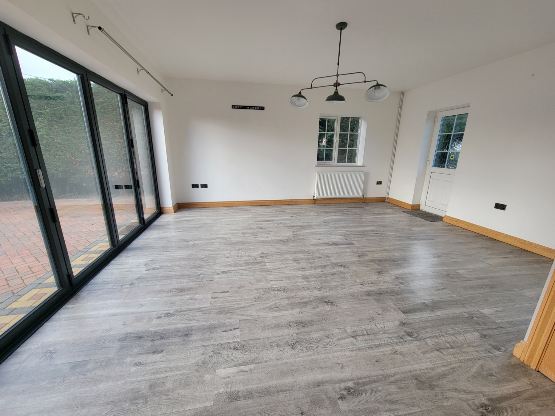 Sun room: 16' 7" x 17' 0" (5.05m x 5.18m) Staircase to the first floor office space, understairs storage area, wood effect flooring, radiator, PVC double glazed windows to the rear and side aspects, PVC part glazed door to the rear, bi-folding door open to the front aspect.