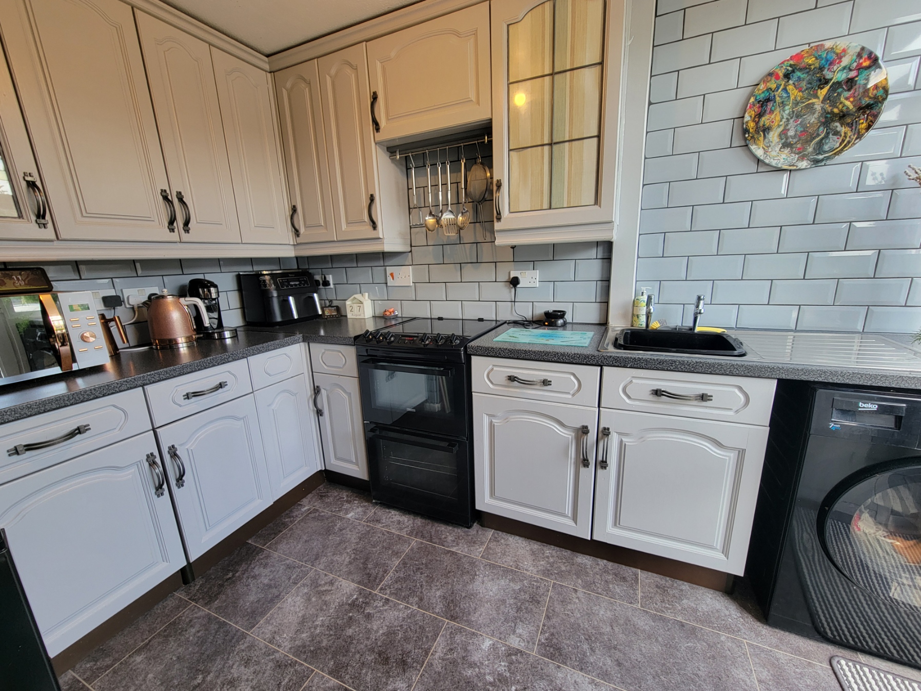10' 6" x 7' 0" (3.2m x 2.13m) Fitted with a range of base and wall mounted units having painted style panelled doors and drawer fronts, built-in shelved larder cupboard, fitted worktops inset stainless steel single bowl sink unit, plumbing for washing machine, electric cooker point, space for fridge/freezer, PVC double glazed door and window to the rear aspect.