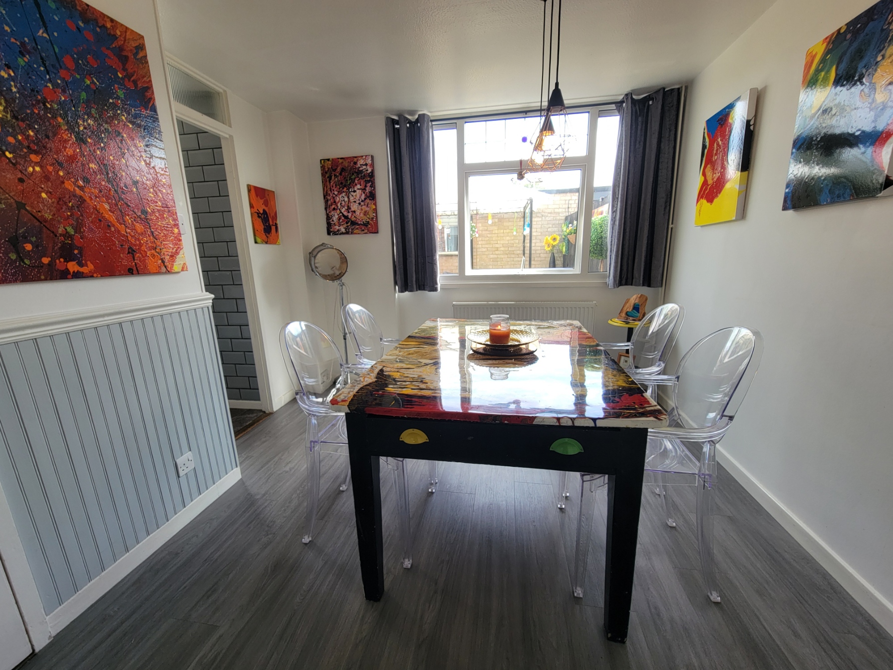 PVC double glazed door with decorative lead light, built-in double storage cupboard, study area, staircase to the first floor, decorative dado rail.