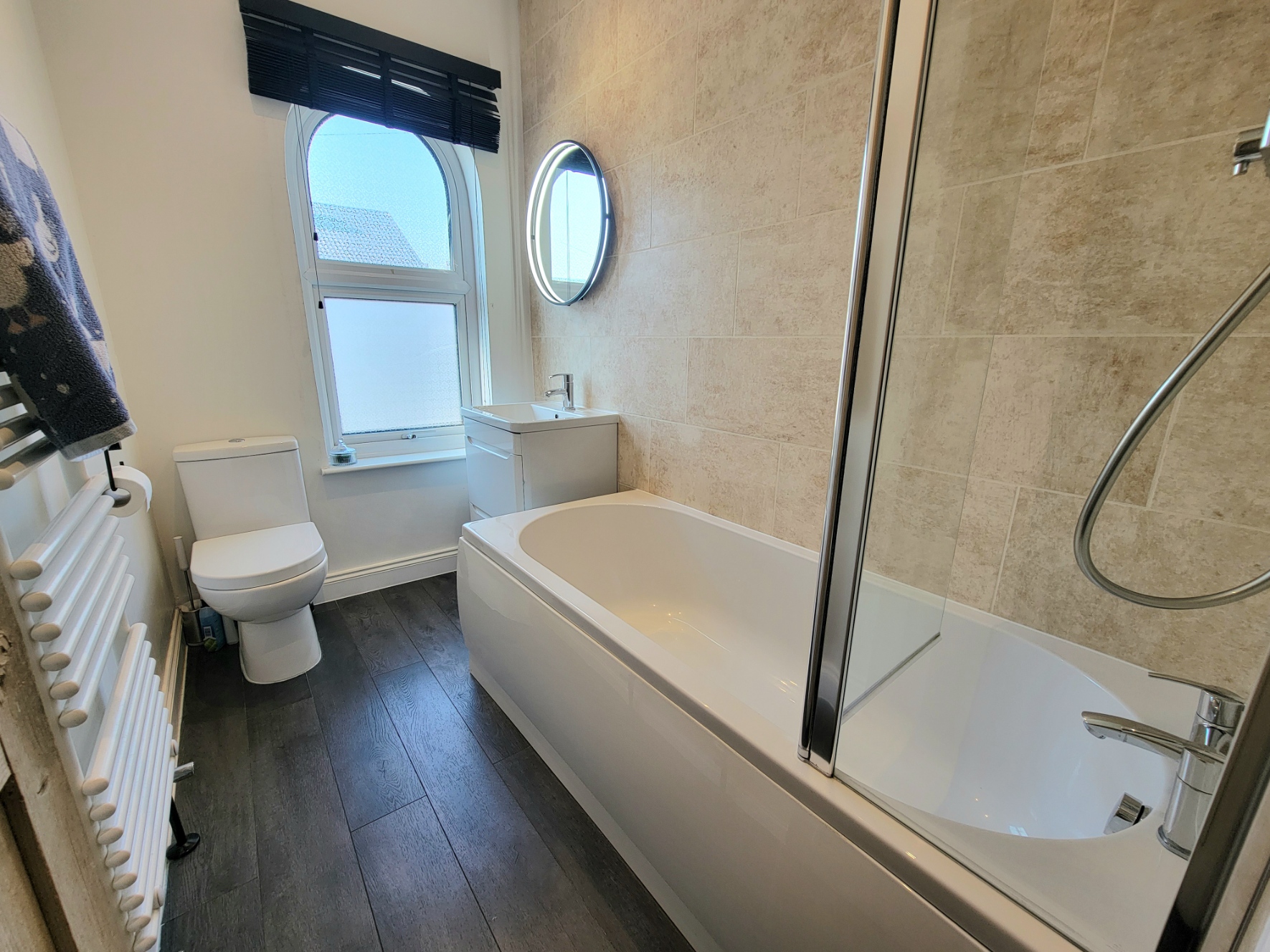 Bathroom: 8' 2" x 5 ' 0" (2.49m x 1.52m) Modern white suite comprises low level wc, panel bath with mono mixer tap, shower connected over and pivot glazed screen and vanity unit with inset wash hand basin, mono mixer tap and storage drawers below, cast iron style towel radiator, wood effect stripped floor, stone effect wall tiling, PVC archtop window to the front aspect.