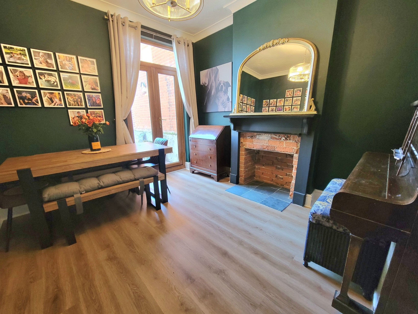 Dining room: 11' 6" x 10' 6" (3.51m x 3.2m) Radiator, chimney breast with Victorian style wooden fire surround, red brick back and slate tiled hearth, wood effect stripped flooring, PVC double glazed wood grain effect French doors opening to the garden.