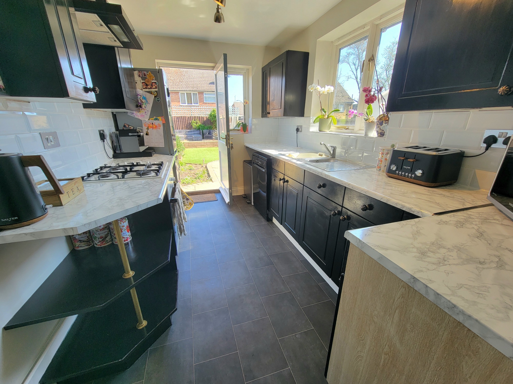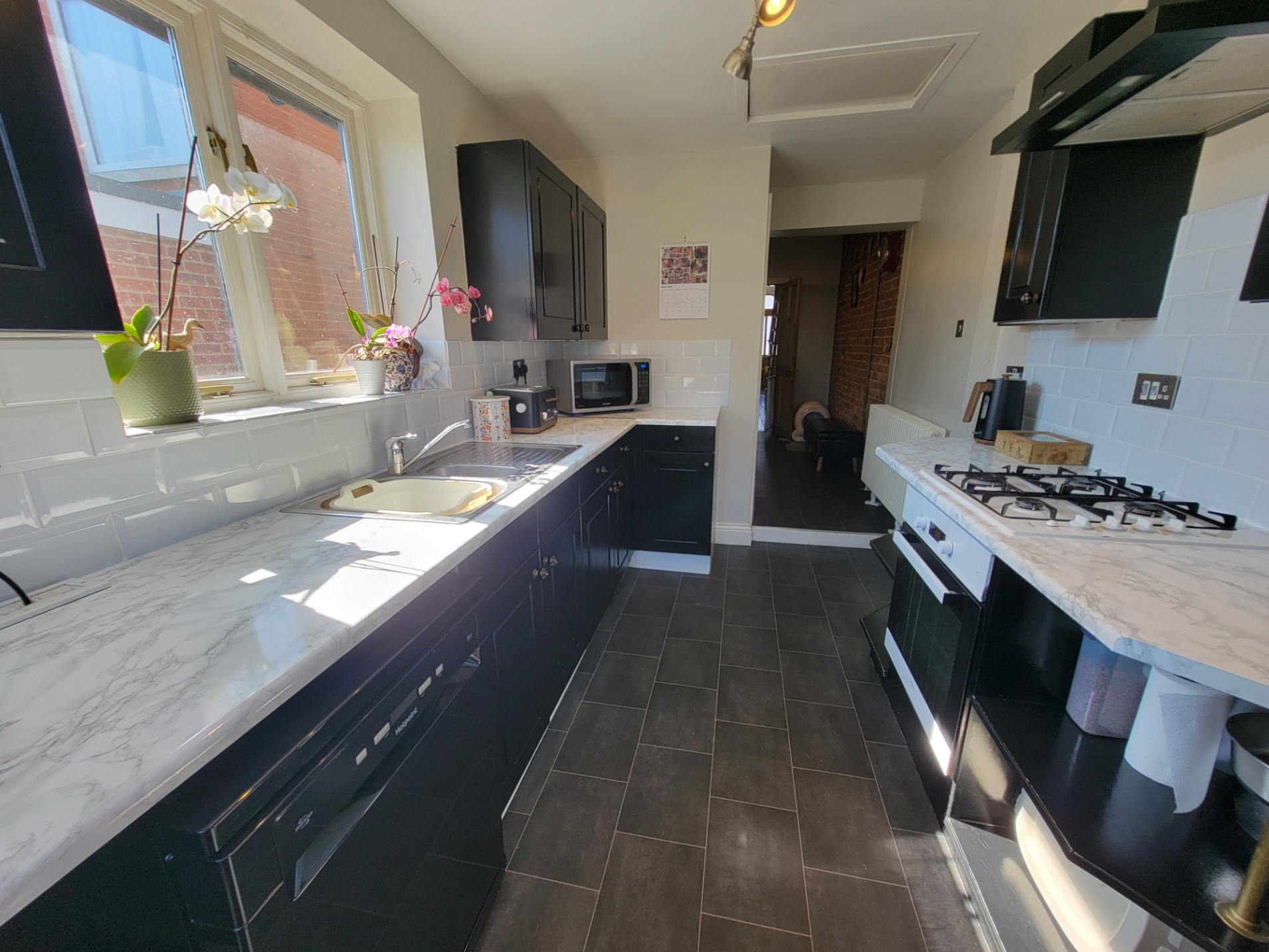 Kitchen: Fitted with a good range of base and wall mounted units having shaker style painted doors and drawer fronts, fitted marble effect worktops inset with one and a half bowl sink unit with mono mixer tap, built-in electric oven, four ring gas hob above, extractor hood connected over, space for generous fridge/freezer, plumbing for dishwasher, tile effect flooring, access to the loft space, half glazed wooden door and window opening to the garden.