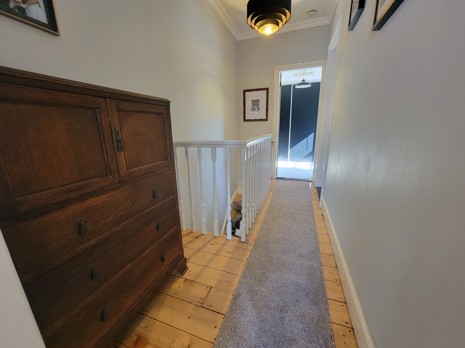 Impressive first floor landing: Stripped and polished pine floor, galleried decorative balustrading, built-in linen cupboard, access to the loft space.