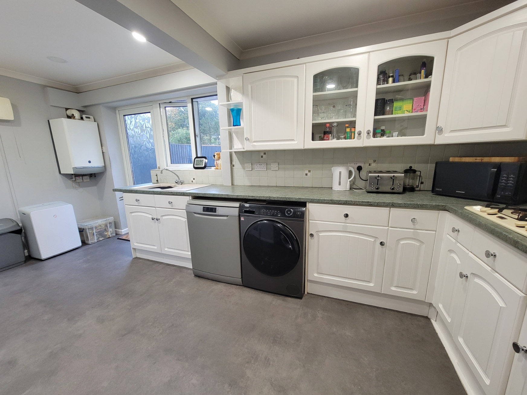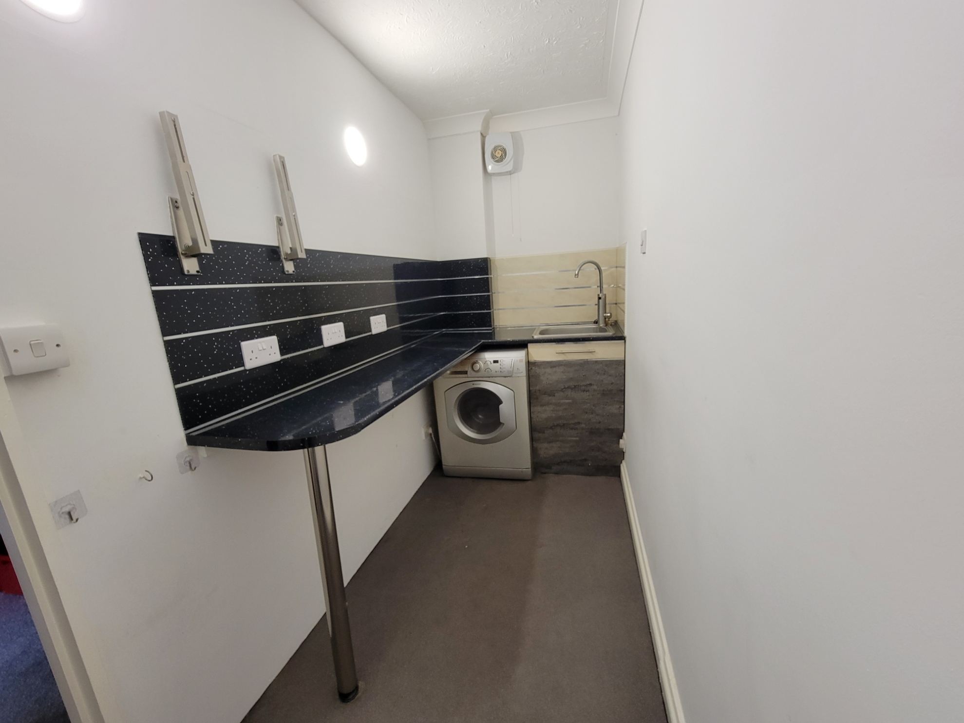 Kitchen: 19' 2" x 5' 0" (5.84m x 1.52m) Fitted base storage cupboard, plumbing for washing machine, fitted worktop inset with stainless steel single bowl sink unit mixer tap, shower board splashback, extractor fan, wall lights.