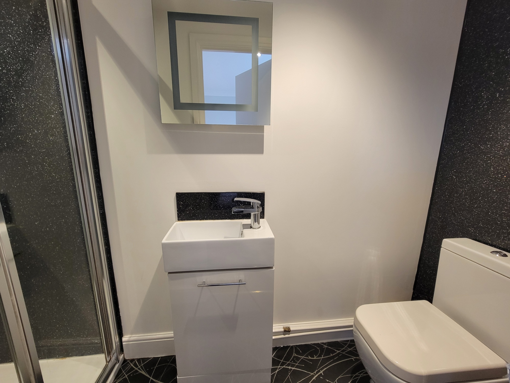 En-suite: Contemporary white suite comprises low level wc, independent shower enclosure with pivot glazed screen and sparkling shower board, vanity unit with inset ceramic wash hand basin with mono mixer tap and storage cupboard below, extractor fan, spotlights.