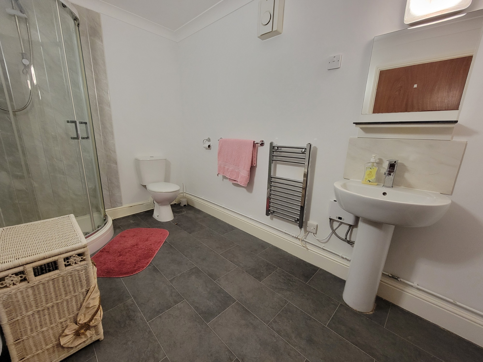 Shower/wetroom: 10' 6" x 6' 4" (3.2m x 1.93m) Low level wc, pedestal wash hand basin, independent curved shower enclosure with glazed screen, extractor fan, electric wall heater, chrome towel radiator.