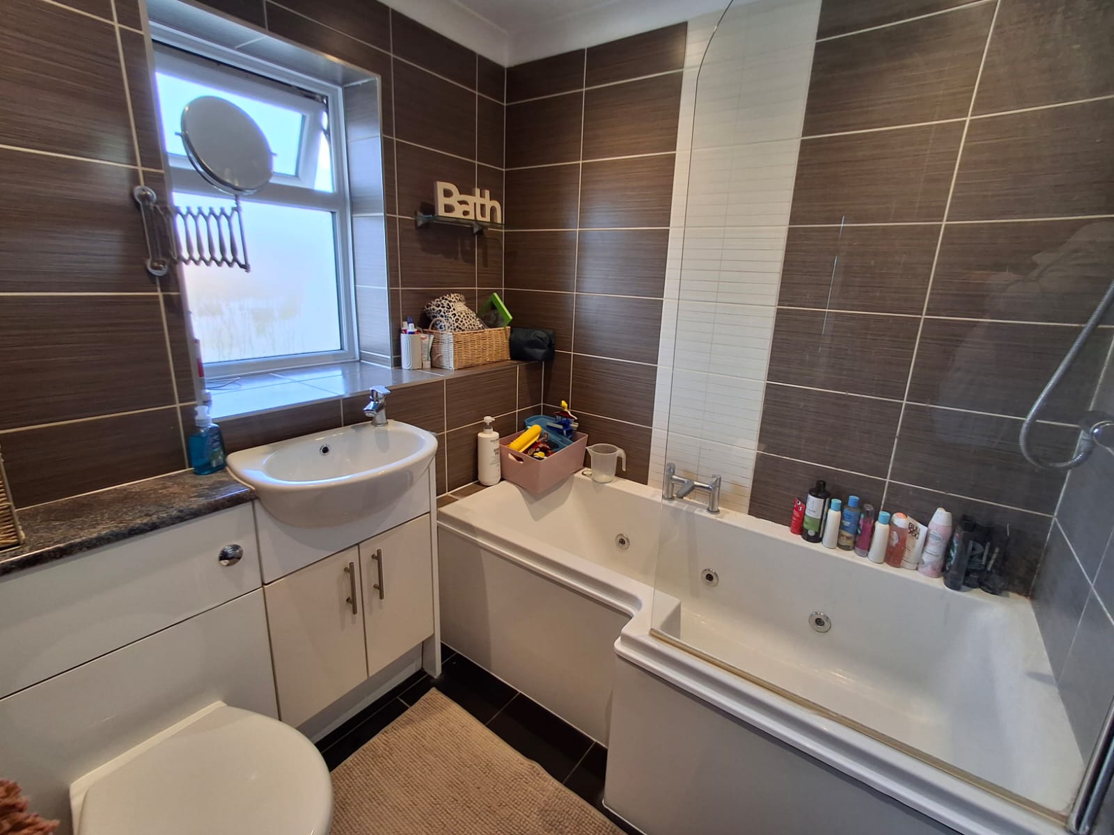 Modern suite comprises vanity unit with inset low level wc with concealed cistern and worktop above, inset wash hand basin with storage cupboards below and shower jacuzzi bath with shower connected over and glazed screen, extensive wall tiling, heated towel radiator, PVC double glazed window to the rear.