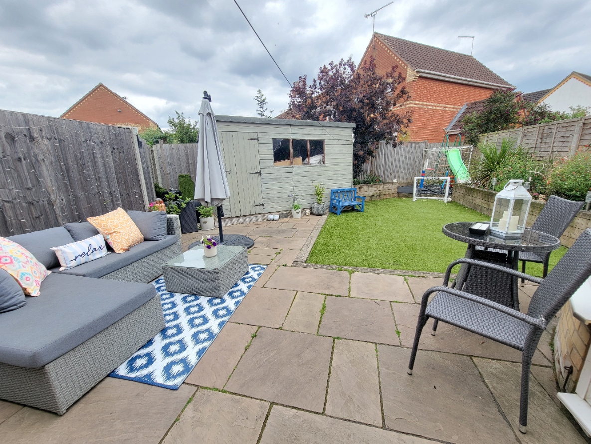 The hosue is set back with garden to the front being laid to lawn with mature shrubs. Drive to the side provides parking and gives access to the garage with up and over door and door leading directly to the garden, currently sub-divided to provide both storage space and work from home space. The rear the garden has been landscaped with large paved terrace, lawn, raised sleeper, flower and shrub borders, timber garden store, fenced boundaries.