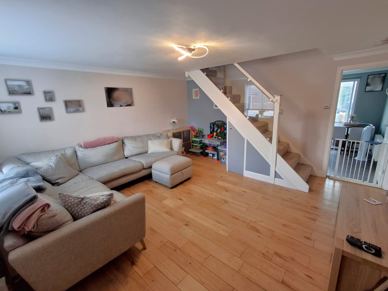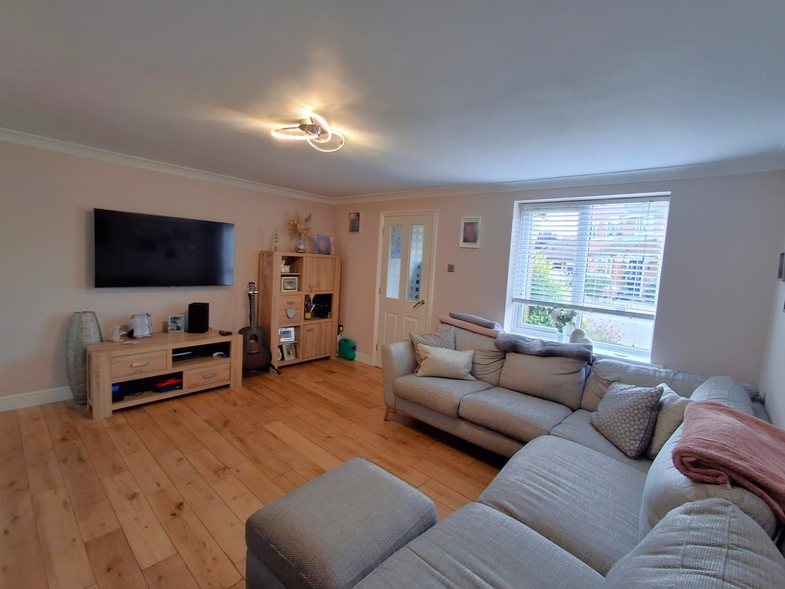 14' 10" x 14' 1" (4.52m x 4.29m) Radiator, wood flooring, tv point, staircase to the first floor, built-in understairs storage cupboard, PVC double glazed window to the front aspect.