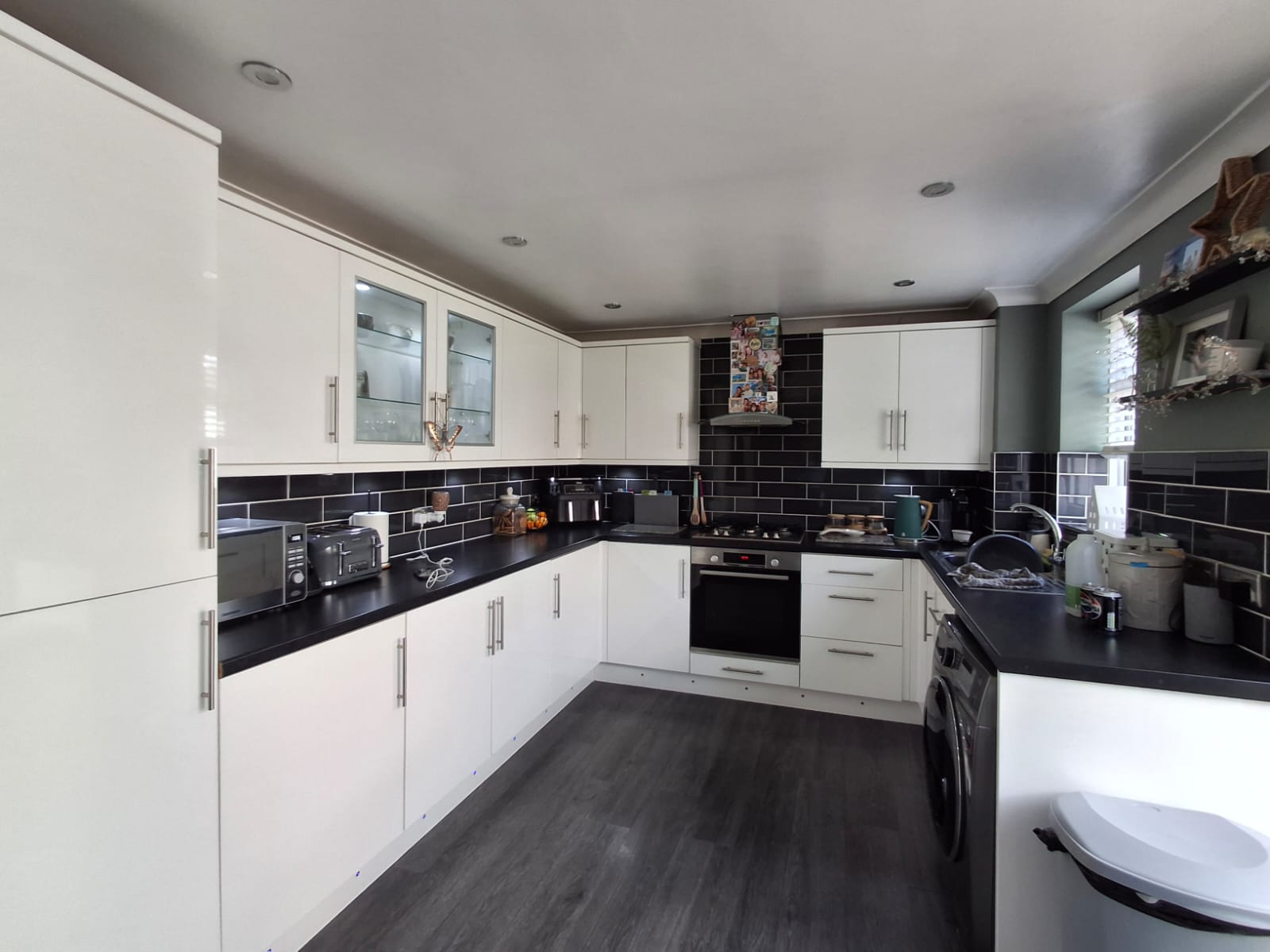 14' 10" x 9' 5" (4.52m x 2.87m) Fitted with a good range of modern base and wall mounted units having matching white doors and drawer fronts, fitted worktops inset with stainless steel single bowl sink unit with mixer tap, metro style tiled splash backs, built-in appliances include dishwasher, fridge/freezer, stainless steel and black glass oven, stainless steel four ring gas hob above and stainless steel extractor fan connected over, plumbing for washing machine, radiator, PVC double glazed window and sliding patio doors to the conservatory.