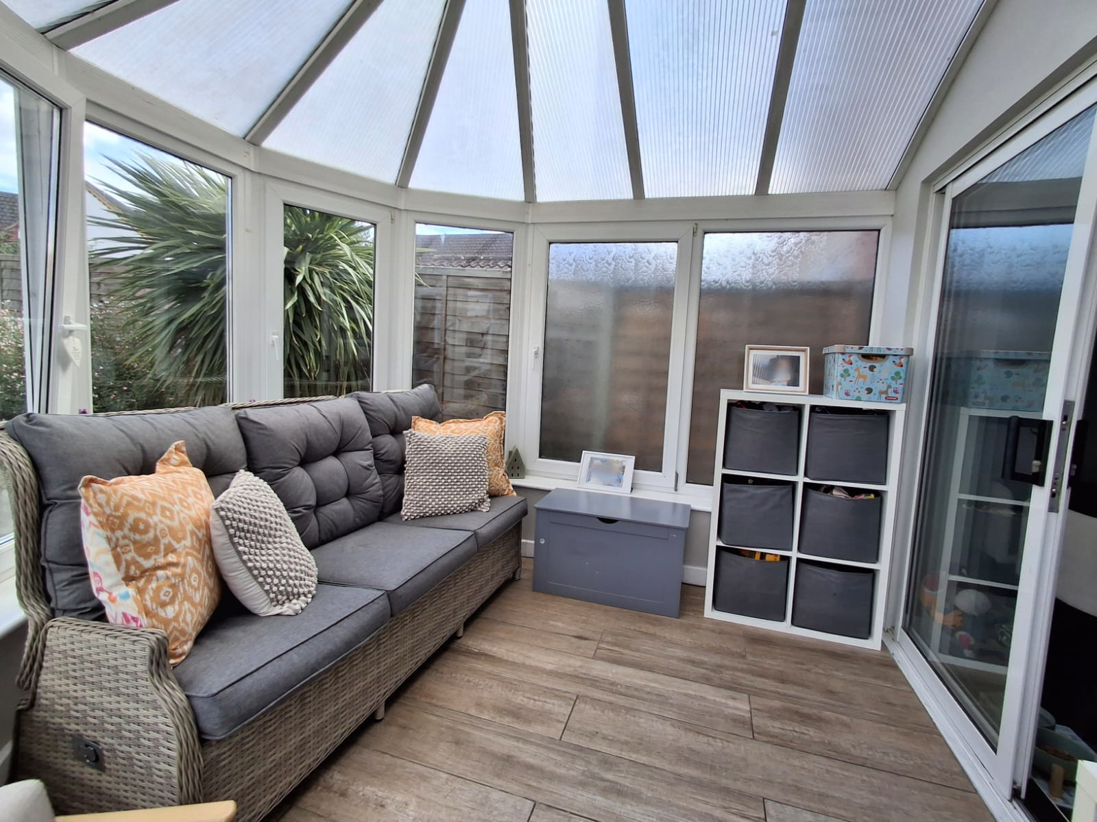 PVC double glazed construction upon a brick plinth with pitched roof, wood flooring, PVC double glazed French doors opening to the garden.